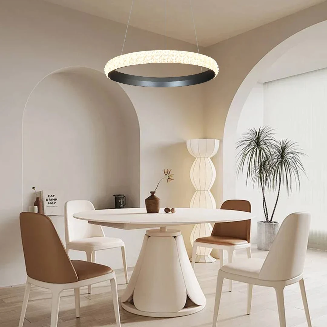 ثريا معلّقة بتصميم مودرن حلقي تضيف لمسة أناقة وعصرية للمداخل وغرف الطعام الراقية. تجمع بين مظهر أنيق ووظائف عملية لإضاءة فورية ومريحة.