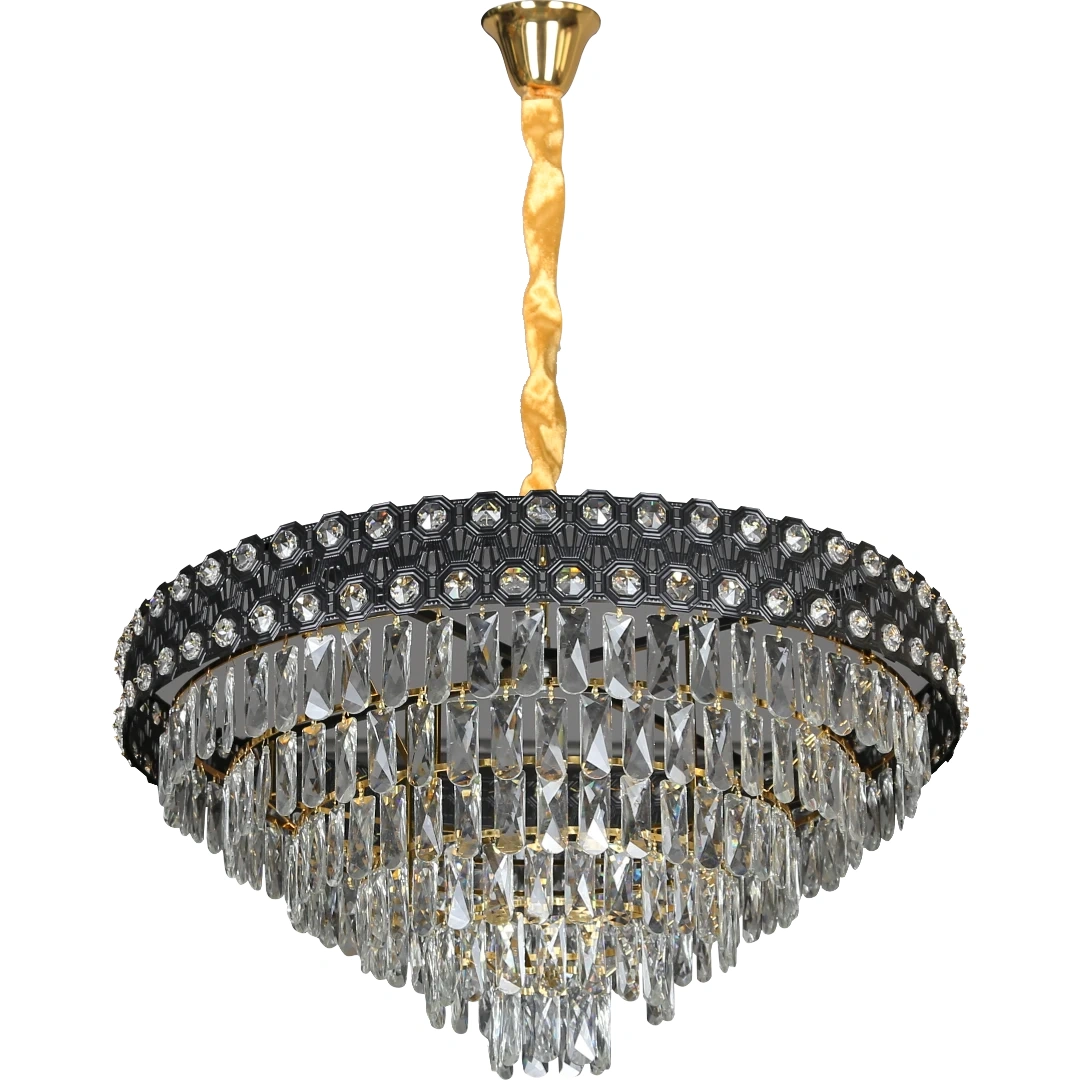 إضاءة كريستال بطراز أوروبي تجمع بين الفخامة والحداثة. تصميم أنيق بالأسود والذهبي يمنح الغرفة لمعانًا راقيًا ومظهراً مميزًا يلفت الأنظار.