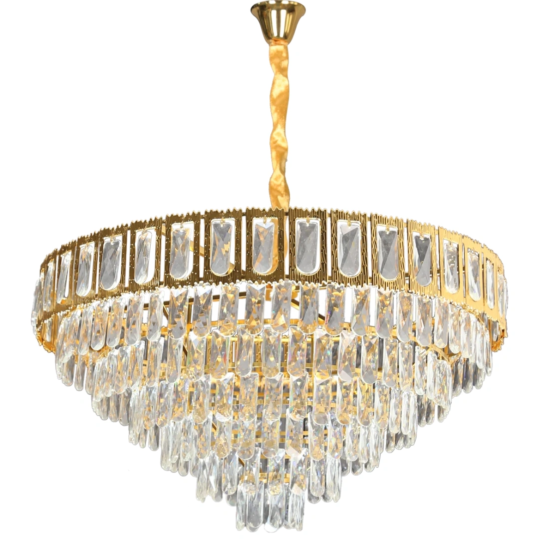 تصميم أوروبّي كلاسيكي بلمسة مودرن تجمع بين الفخامة والرصانة، مثالي لإضاءة الصالونات، غرف الطعام والمدخلات الواسعة. يجمع هذا النجف بين هيكل معدني مطلي باللون الذهبي وقطع كريستال شفافة تعكس الضوء لإطلالة راقية ودافئة.