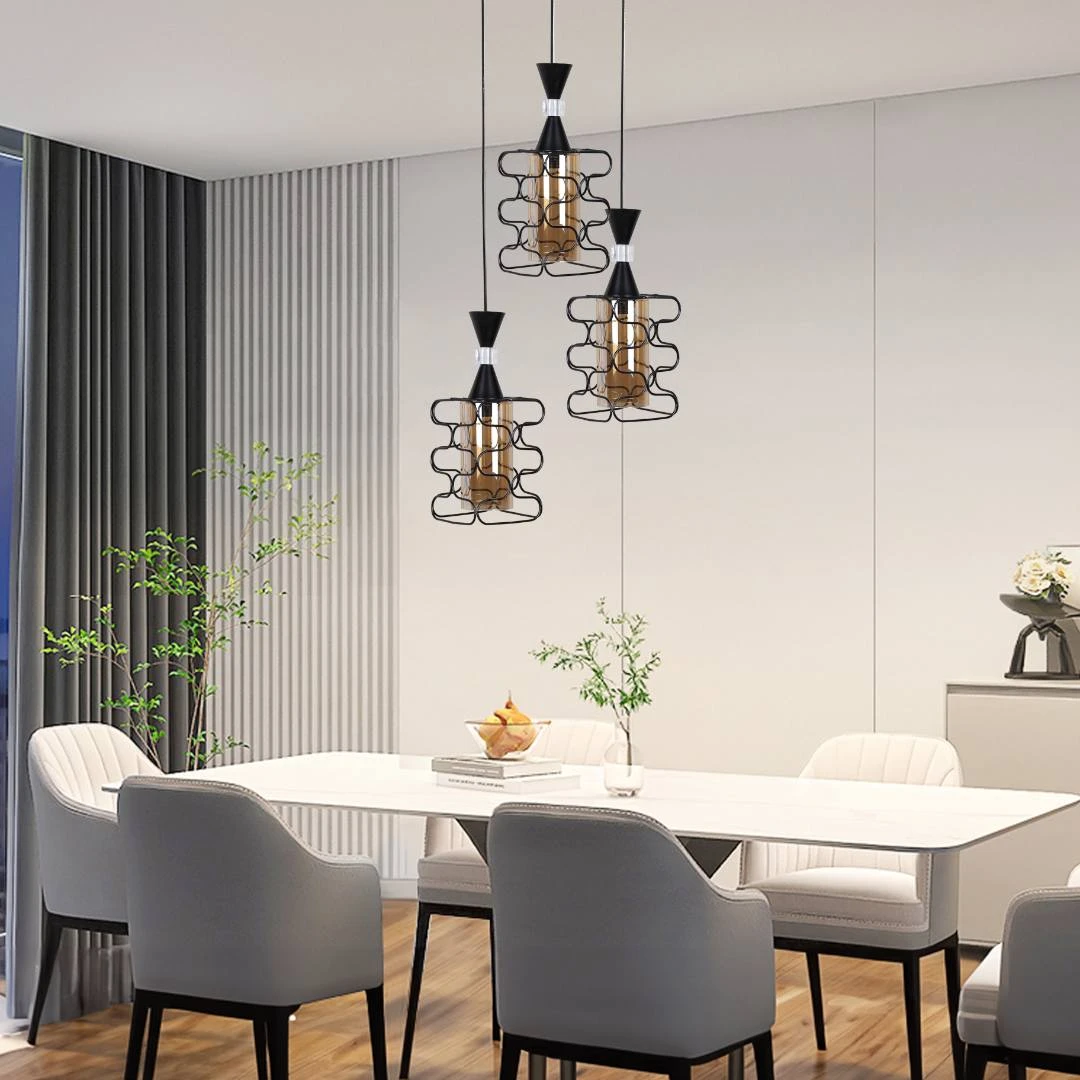 إضاءة مودرن أنيقة ومناسبة للمساحات الداخلية — تصميم أسود بسيط يعزز ديكور المعيشة والمطابخ والمطاعم والممرات. يدعم ثلاث قواعد لمبات بحجم E27 لمرونة اختيار لمبات LED أو المصابيح التقليدية حسب الحاجة.