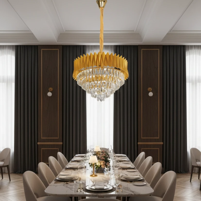 ثريا أوروبية تمنح المكان إضاءة متوازنة بطابع كلاسيكي راقٍ — تصميم مودرن مع لمسات كريستالية فاخرة يبرز أنيقة المساحات الداخلية.