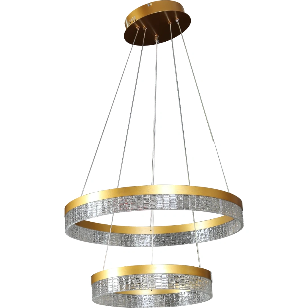 لمبة معلقة بتصميم مودرن مكوّنة من حلقتين (مقاسات 40 سم و60 سم) بلمسة ذهبية راقية. تعتمد على تقنية LED ثلاثية الألوان (دافئ، طبيعي، بارد) لتمنحك تحكماً سهلاً في درجة الإضاءة والمزاج العام للمكان مع استهلاك طاقة إجمالي مقداره 135 واط.