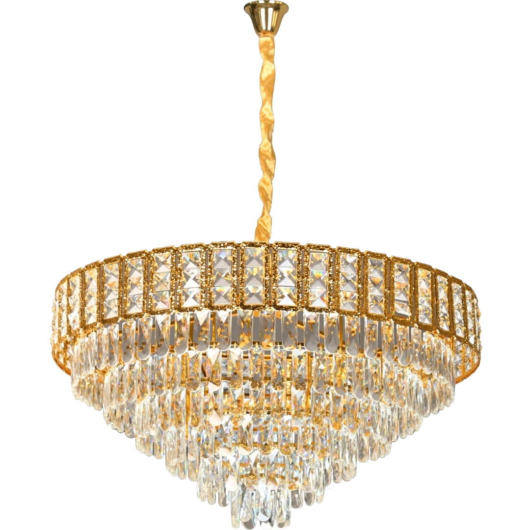 ثريا أوروبية عصرية تجمع بين الفخامة والدفء؛ تصميم ذهبي مع قطع كريستال تعكس الضوء برقة لإضاءة غنية وأنيقة تناسب المساحات الراقية.