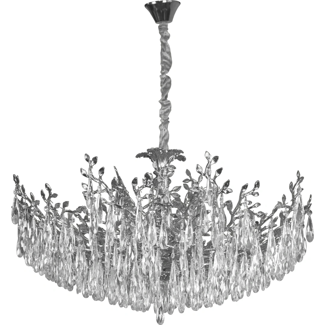 علاقي سقفي بتصميم مودرن باللون الفضي، مزوّد بقطع كريستال أوروبي تعكس الضوء وتخلق تأثيرات بصرية أنيقة وحيوية. التصميم يجمع بين مظهر فخم ومعاصر يجعل الإضاءة جزءًا من ديكور الغرفة نفسه.