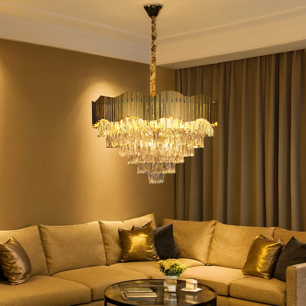 ثريا كريستالية ذات طابع أوروبي مودرن تضفي دفئًا وأناقة راقية على أي مساحة داخلية. تصميم متقن يبرز بريق الكريستال مع لمسات تشطيب ذهبي تمنح المكان طابعًا ملكيًّا دون المبالغة.