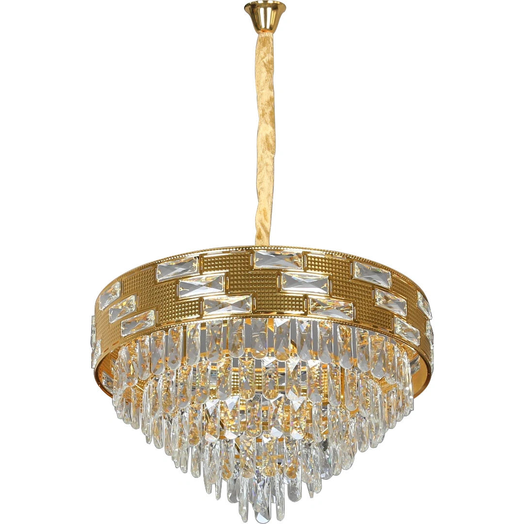 تتألق هذه الثريا بطبقات كريستال أوروبي مصقولة مرتبة بشكل متدرج حول هيكل ذهبي أنيق، مما يخلق تأثيرًا بصريًا فاخرًا وإضاءة متوزعة ومتوازنة. مثالية لغرف المعيشة، الصالونات، غرف الطعام أو مداخل المنازل الفاخرة والمحلات الراقية.