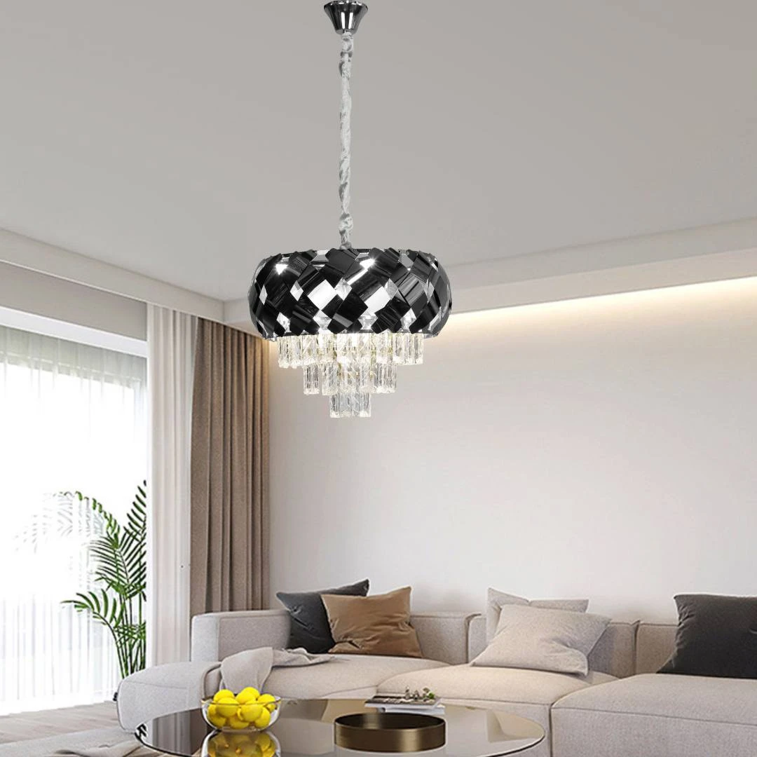 نجف مودرن بتشطيب فضي مع كريستالات أوروبية شفافة تعكس الضوء بشكل متناغم، مناسب لغرف المعيشة، غرف الطعام أو الممرات الفخمة. يجمع بين تصميم معاصر ولمسة كلاسيكية في آن واحد ليكون نقطة محورية أنيقة في أي مساحة داخلية.