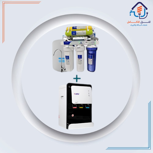جهاز تحلية مياه متطور بسبع مراحل تنقية مدمج مع برادة طاولة أنيقة باللون الأسود. يوفّر مياه شرب نقية، صحية، وباردة مباشرةً في منزلك أو مكتبك، مع تصميم يوفر المساحة ويظهر بمظهر عصري.