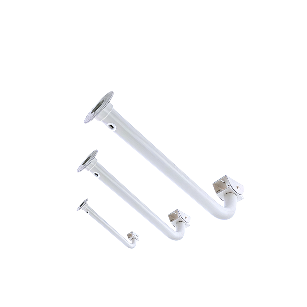 وصف موجز: حامل جداري مائل بطول 30 سم، مصمم لتثبيت كاميرات المراقبة بشكل آمن ومدمج، مصنوع من هيكل معدني مطلي باللون الأبيض مع قواعد تثبيت علوية وسفلية.