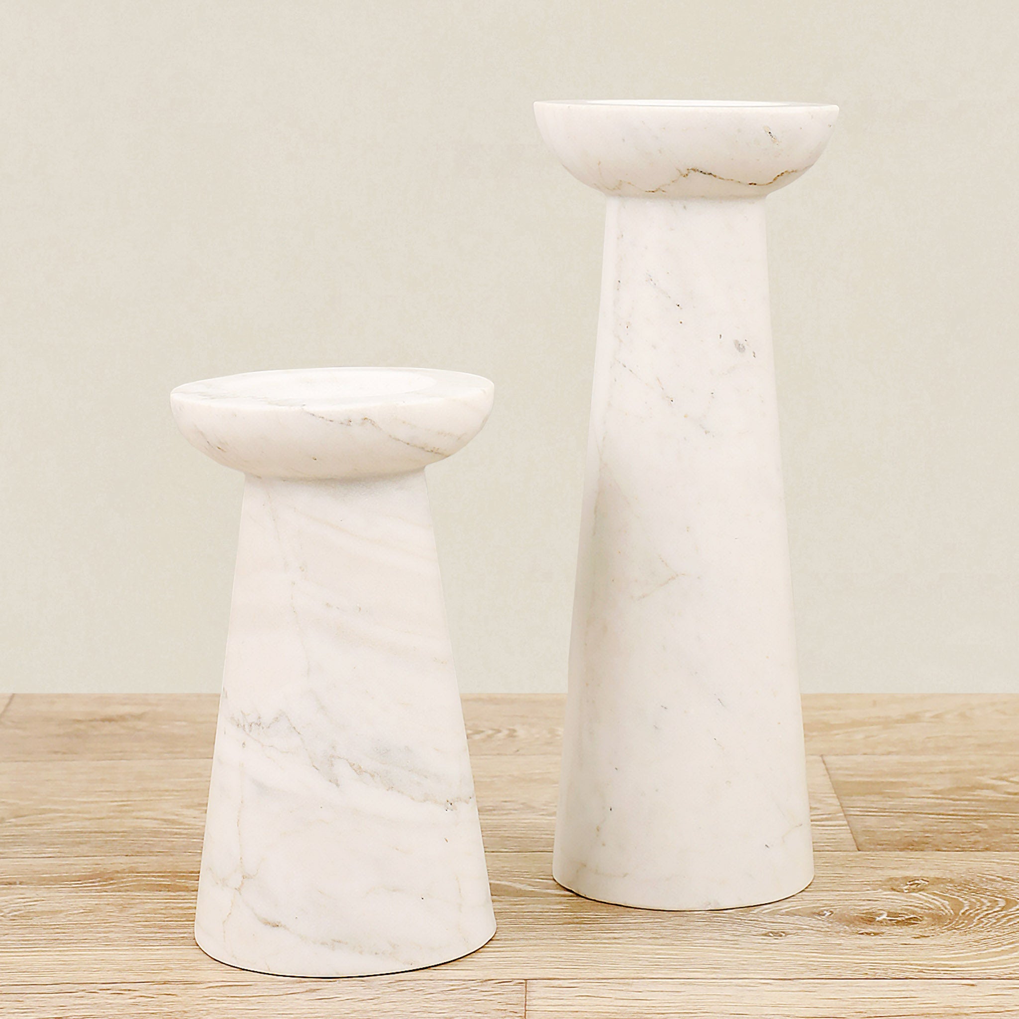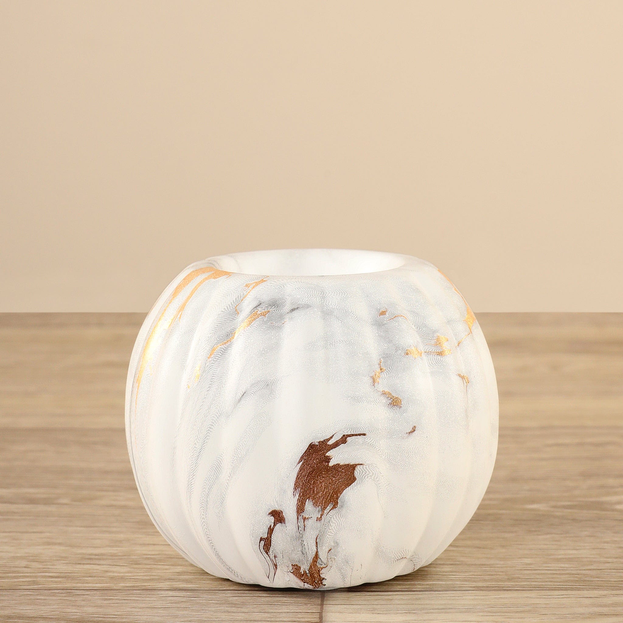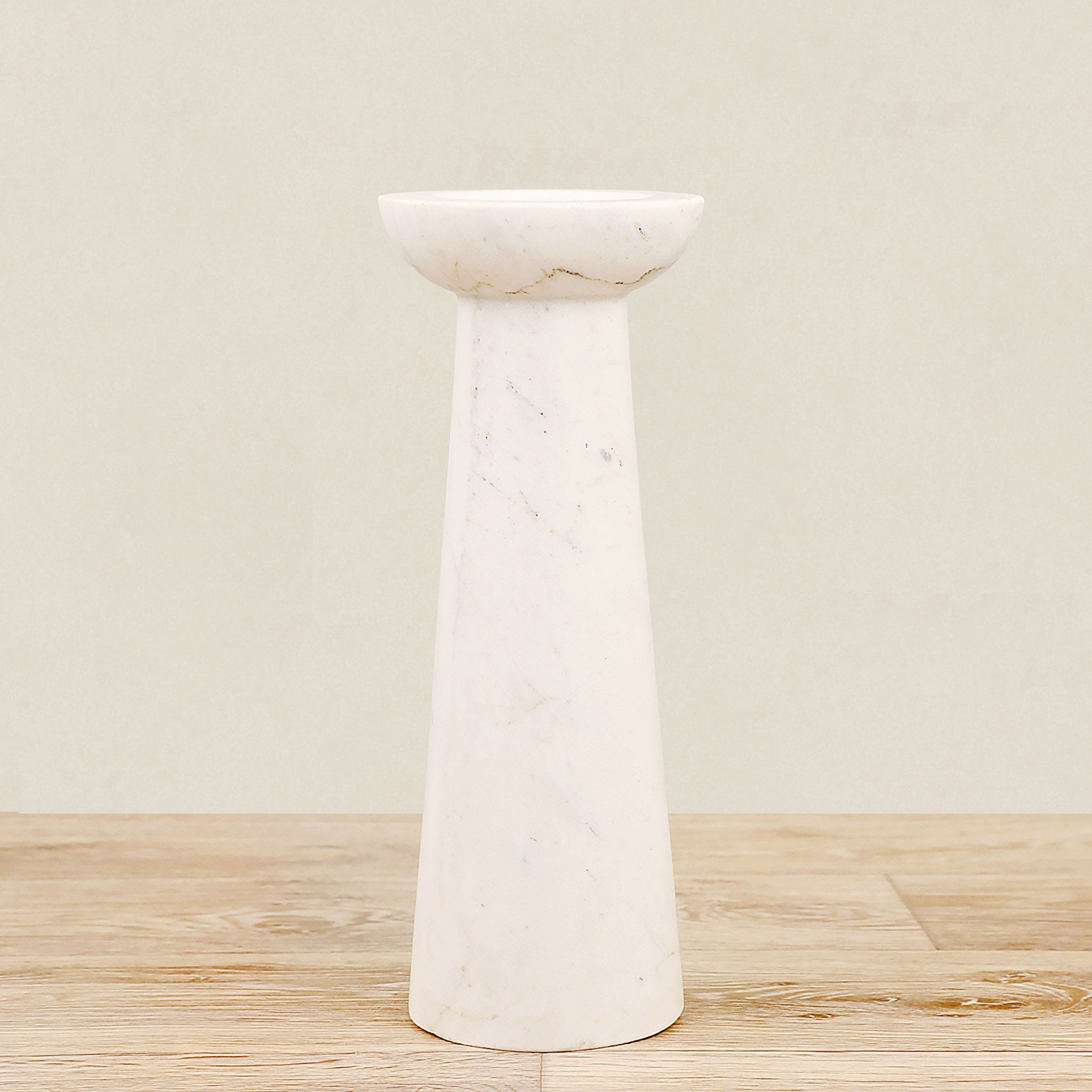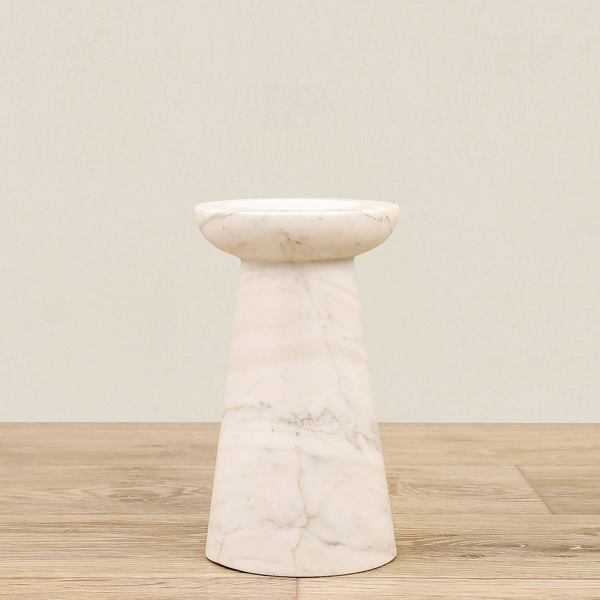حامل شموع بتصميم دائري بسيط ولمسة زخرفية خفيفة تمنحه أناقة رقيقة. يتميز بمظهر رخامي يُضفي إحساسًا فاخرًا، وصُمم بحجم مناسب لحمل شمعة عمودية بشكلٍ ثابت وآمن. تصميمه المتناغم يسهّل تنسيقه مع قطع مشابهة لتكوين لوحة ديكور جذابة.