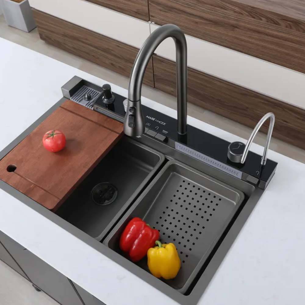 استمتع بمطبخ عصري عملي وأنيق مع هذا الحوض الذكي بلون أسود مطفأ وتصميم متكامل يمنحك تجربة غسيل وتحضير فائقة. مصنوع من الستانلس ستيل 304 عالي الجودة بسطح مقاوم للصدأ وسهل التنظيف، ويجمع بين وظائف متقدمة (شاشة رقمية، خلاطات متعددة، صنبور قابل للسحب) وتصميم جمالي عملي (حوض عميق وشلال مائي).