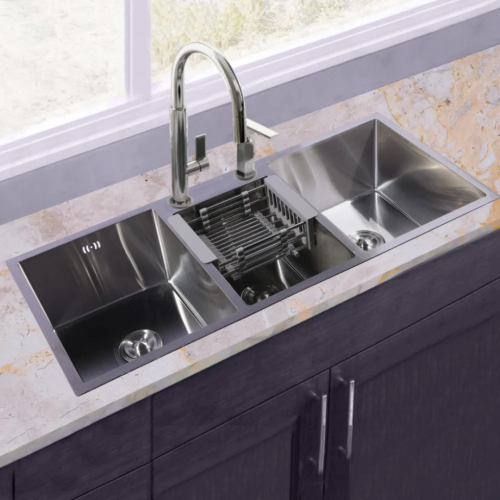 ارتقِ بمطبخك بمغسلة عملية وعصرية مصنوعة من ستانلس ستيل مقاوم للصدأ، مصممة بثلاثة أحواض واسعة لتلبية جميع احتياجات التنظيف والتحضير اليومية مع فتحة جاهزة لتركيب خلاط.