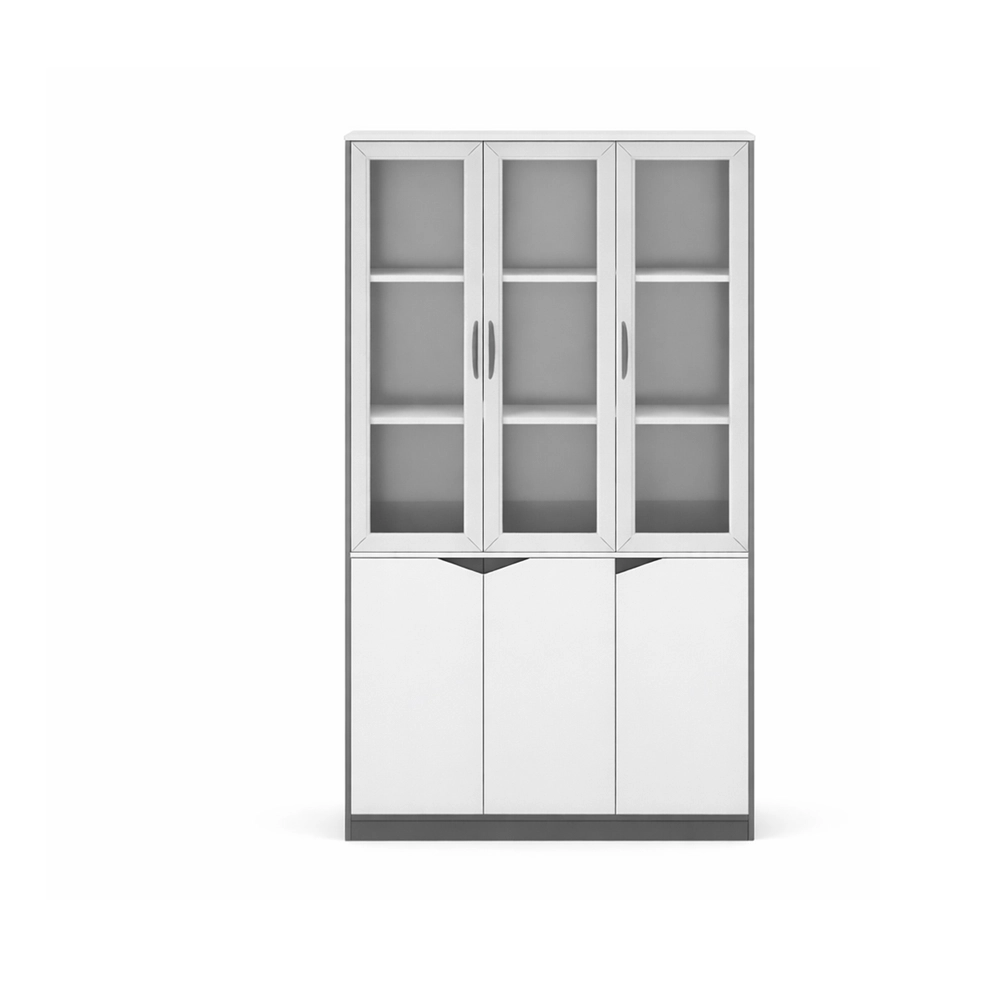 دولاب تخزين مودرن بثلاثة أبواب وواجهة زجاجية — أبيض ورمادي