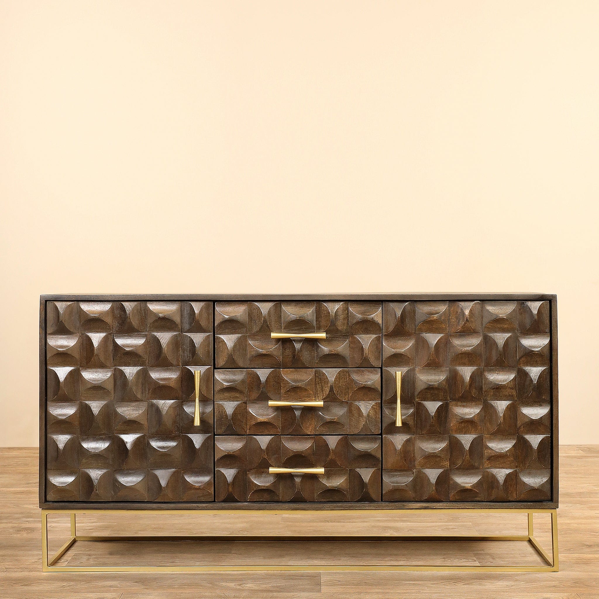 خزانة جانبية أنيقة وعملية تجمع بين دفء الخشب وقوة المعدن، مناسبة لإضافة مساحة تخزين وشخصية دافئة لأي غرفة.