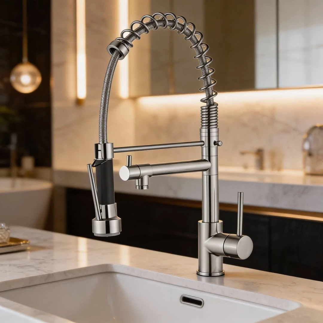 خلاط بمظهر عصري وتصميم عملي يضمن وصول الماء إلى جميع الزوايا بسهولة، مع لمسة نهائية مطلية بالكروم لامعة ومقاومة للصدأ. مناسب للاستخدام اليومي في المجلى ويوفر تحكماً سلساً في تدفق الماء عبر المخرجين.
