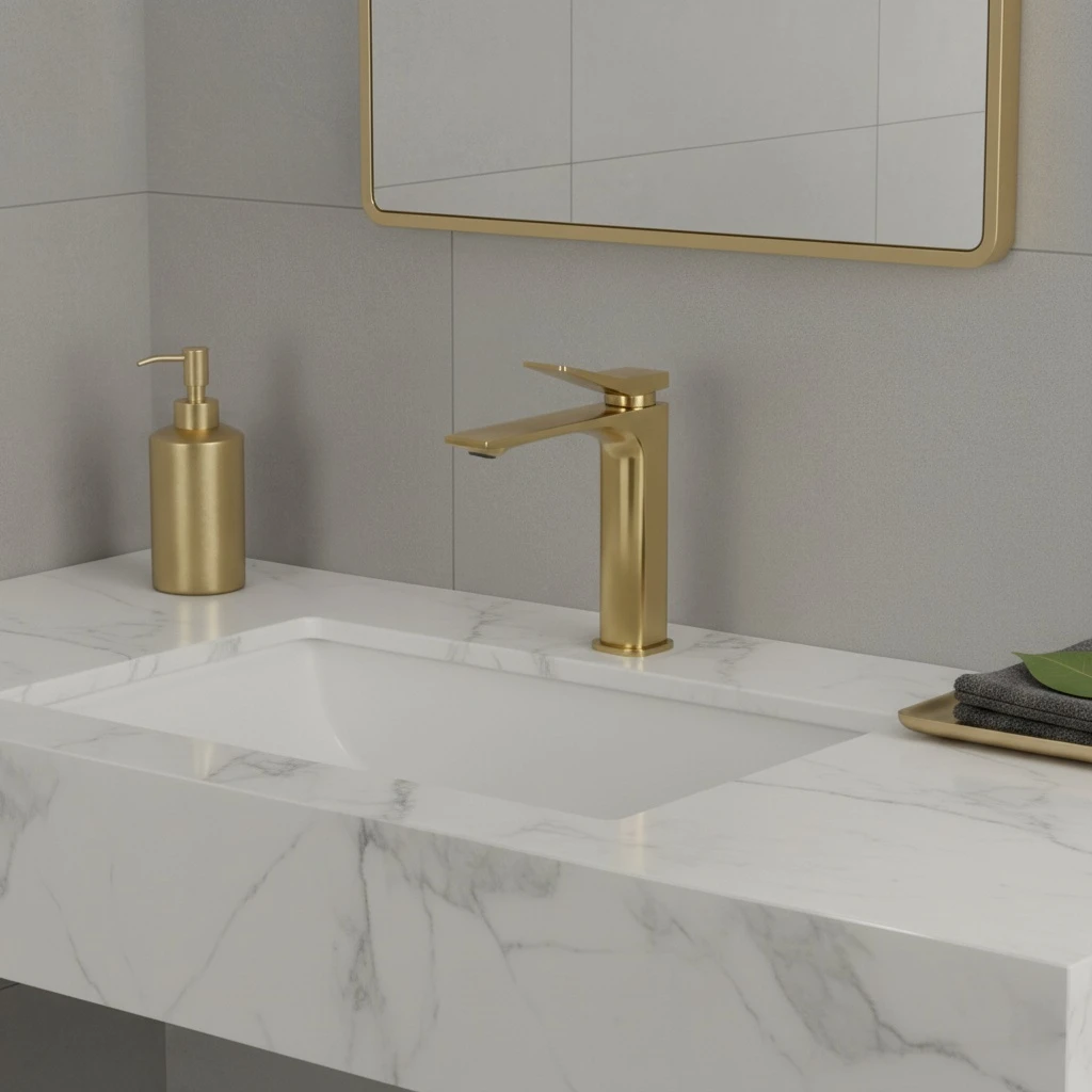 خلاط مغسلة أنيق وعصري بتصميم مربع قصير، بطبقة نهائية ذهبية مطفية تمنح لمسة فاخرة للمغسلة دون لمعان مبالغ. مزود بفتحة عملية في المقبض لتسهيل التحكم في تدفق الماء وبدروم ليات مرنة لتوصيل سريع وآمن.