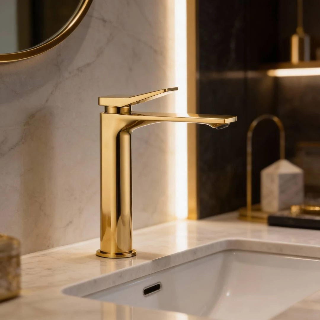 خلاط مغسلة بتصميم عصري مربع وطول مناسب للمغاسل المعاصرة. المقبض مزوَّد بفتحة تصميمية/وظيفية لسهولة الاستخدام، والتشطيب ذهبي مطفي يمنح مظهرًا أنيقًا ومقاومًا للوهج. يأتي مزوَّدًا باليات مرنة لتسهيل التركيب والتوصيل.