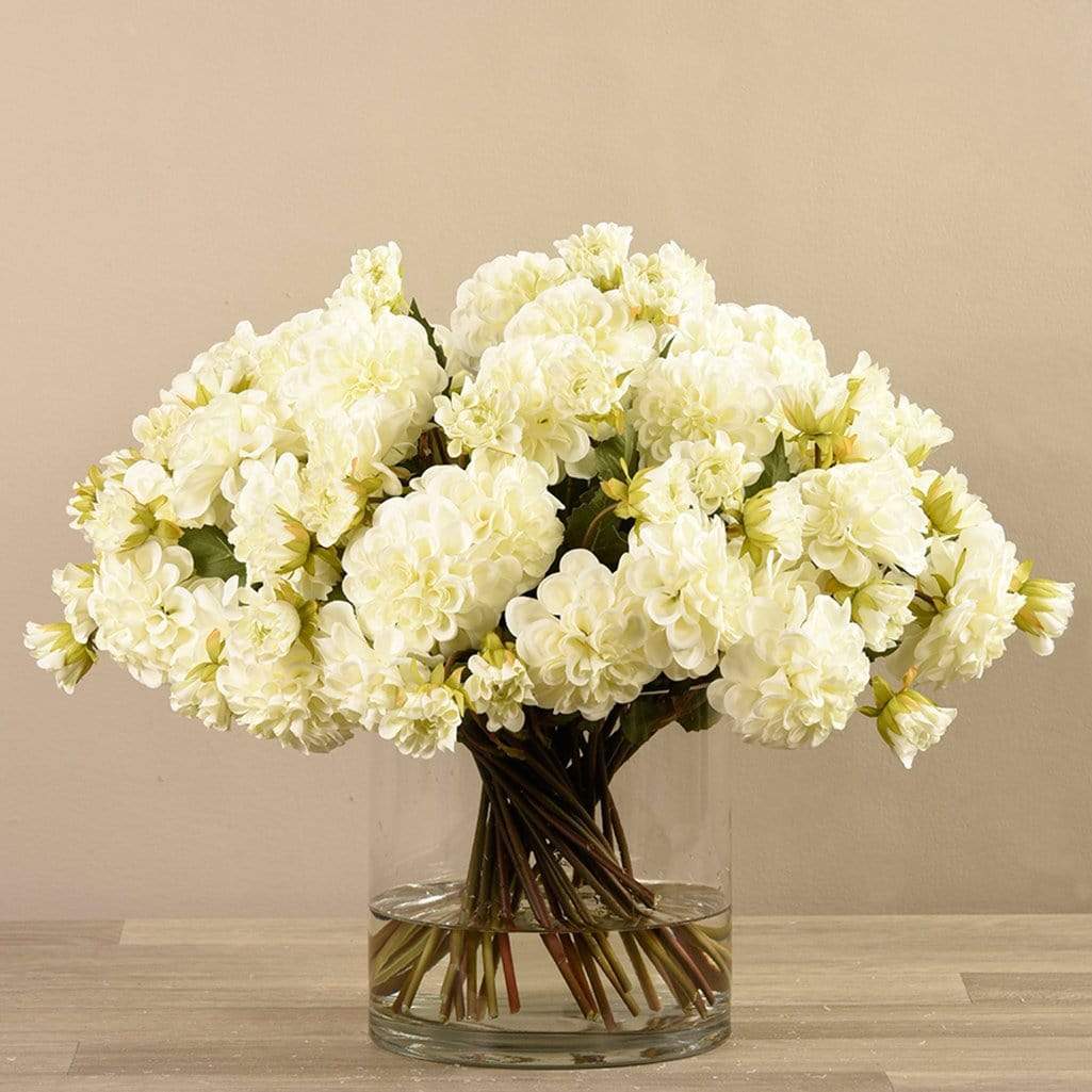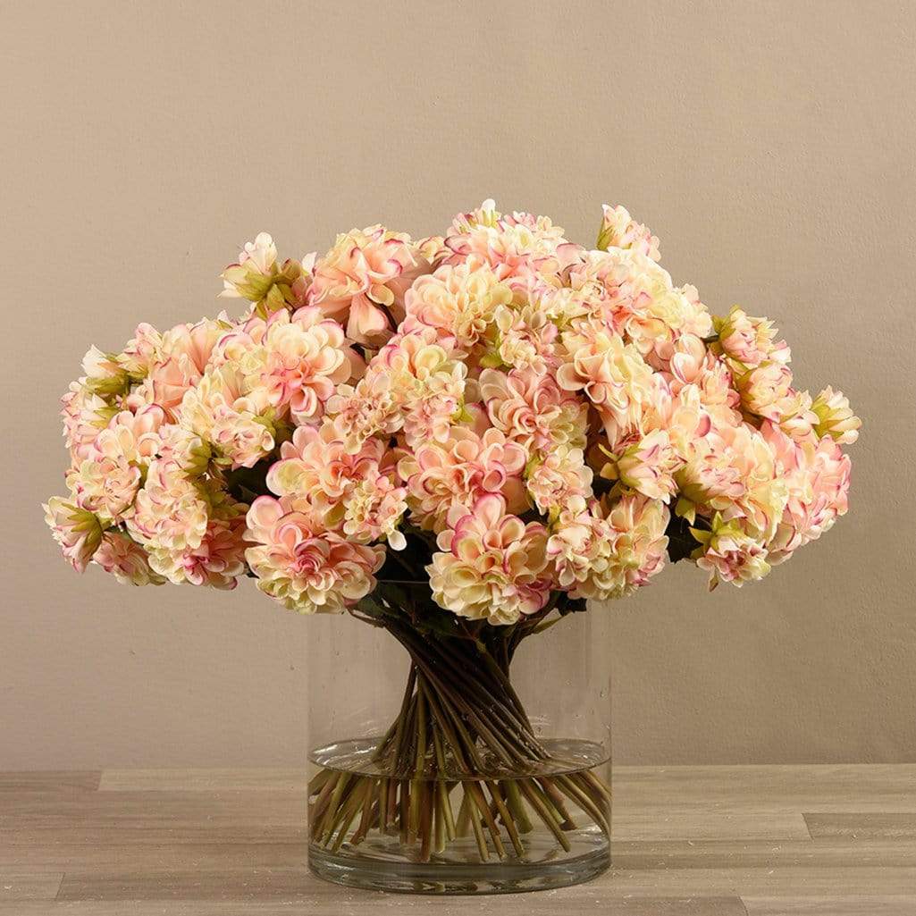 زهور الداليا الصناعية في مزهرية زجاجية