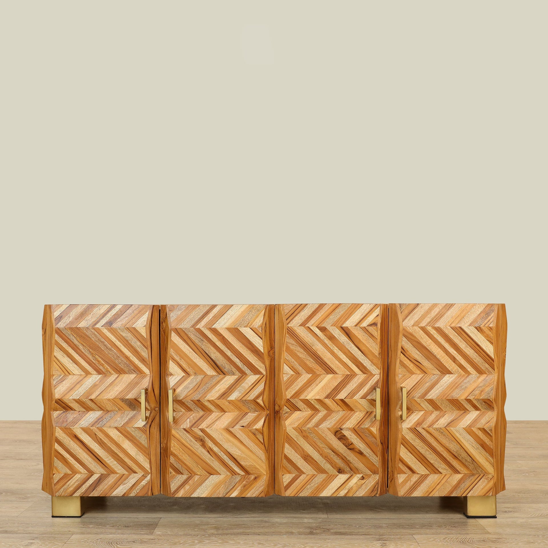 أضف لمسة من الرقي والدفء إلى منزلك مع خزانة جانبية خشبية بتصميم شيفرون ثلاثي الأبعاد. تجمع هذه القطعة بين المظهر الفني والوظيفة العملية، بفضل واجهتها المزخرفة وأبوابها الأربعة التي توفر مساحة تخزين واسعة ومنظمة.