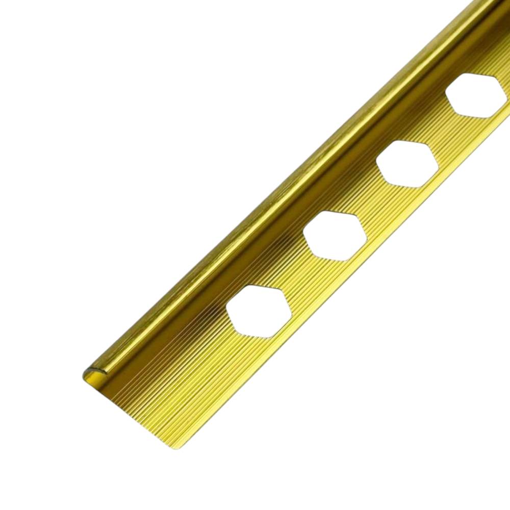 زاوية زخرفية مبرومة باللون الذهبي اللامع بطول 2.50 متر وعرض 12 مم من مجموعة TA001-GB-12H. مصممة من ألمنيوم مؤكسد عالي الجودة (6063) لتجهيز حواف بلاط أنيقة ومحمية مع سهولة تركيب ومظهر فاخر يدوم.
