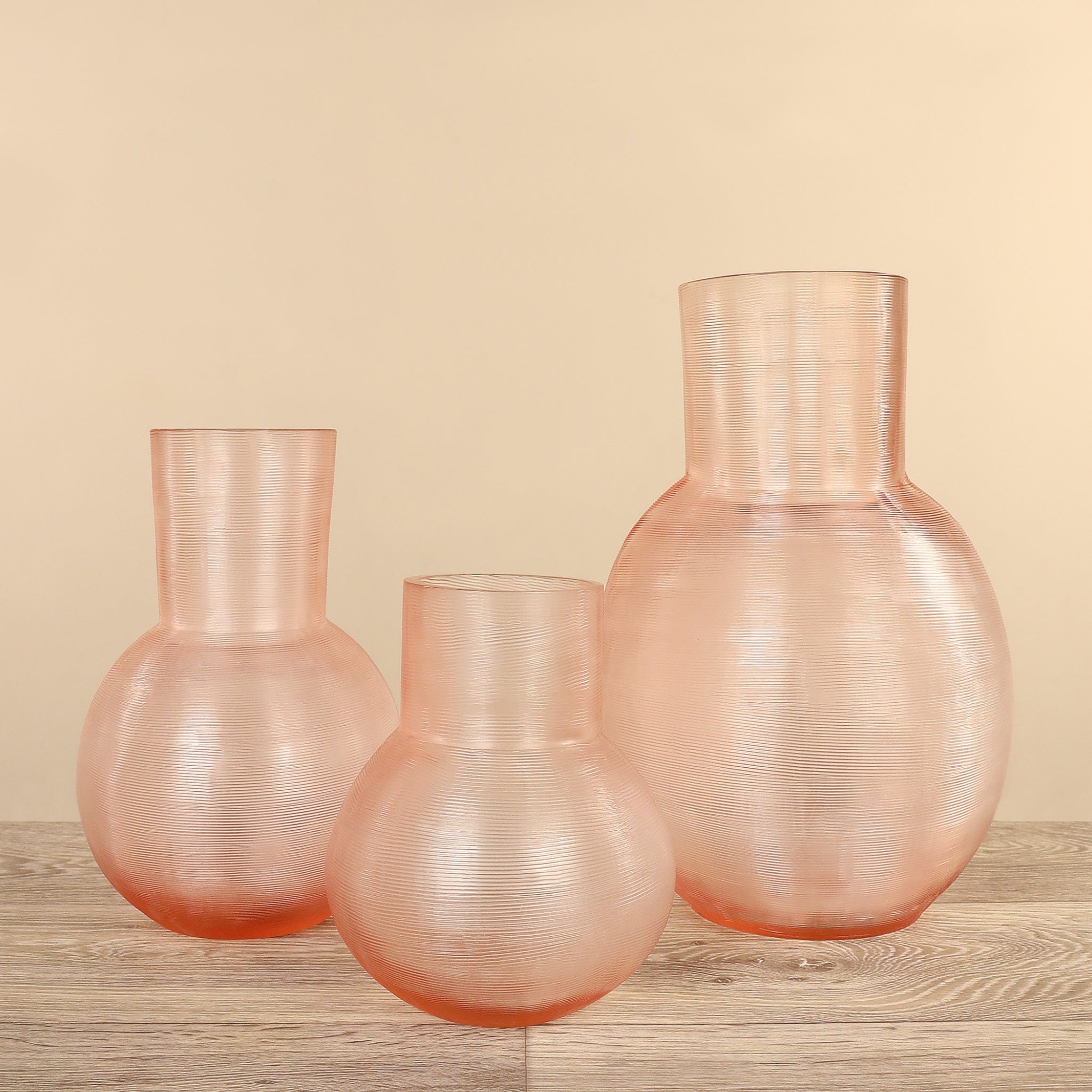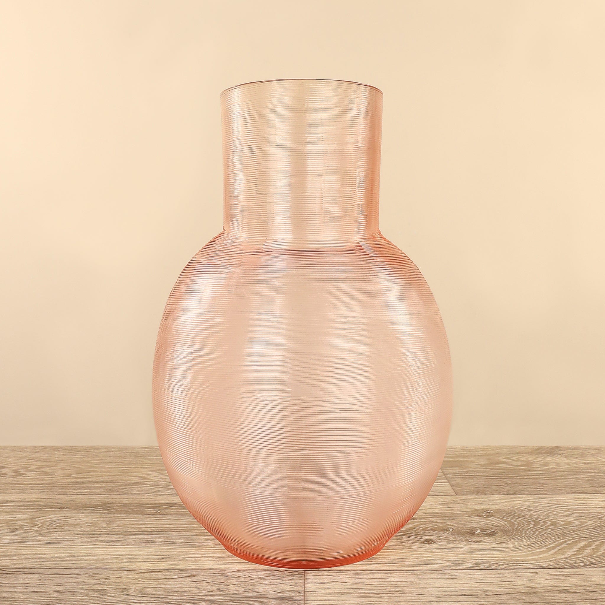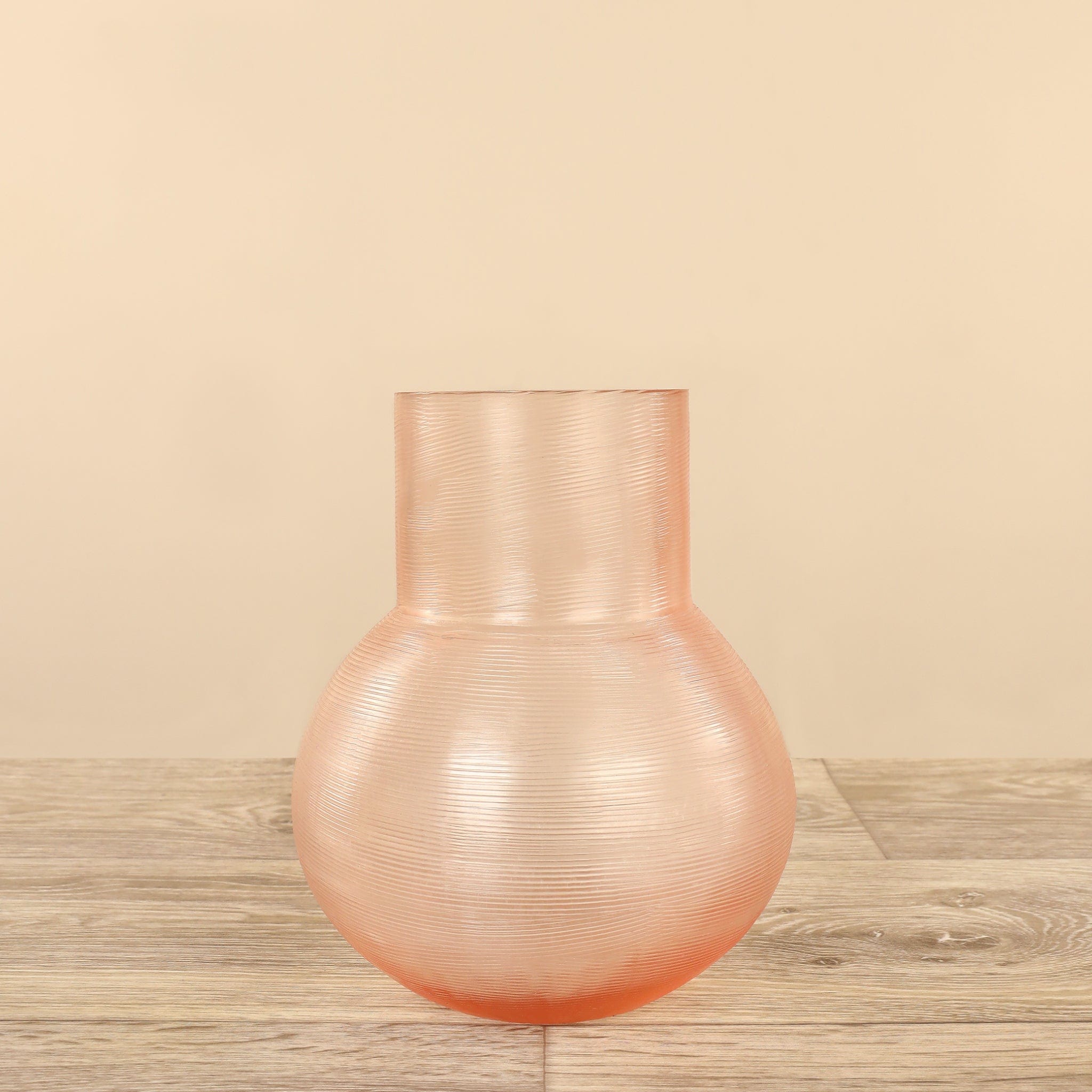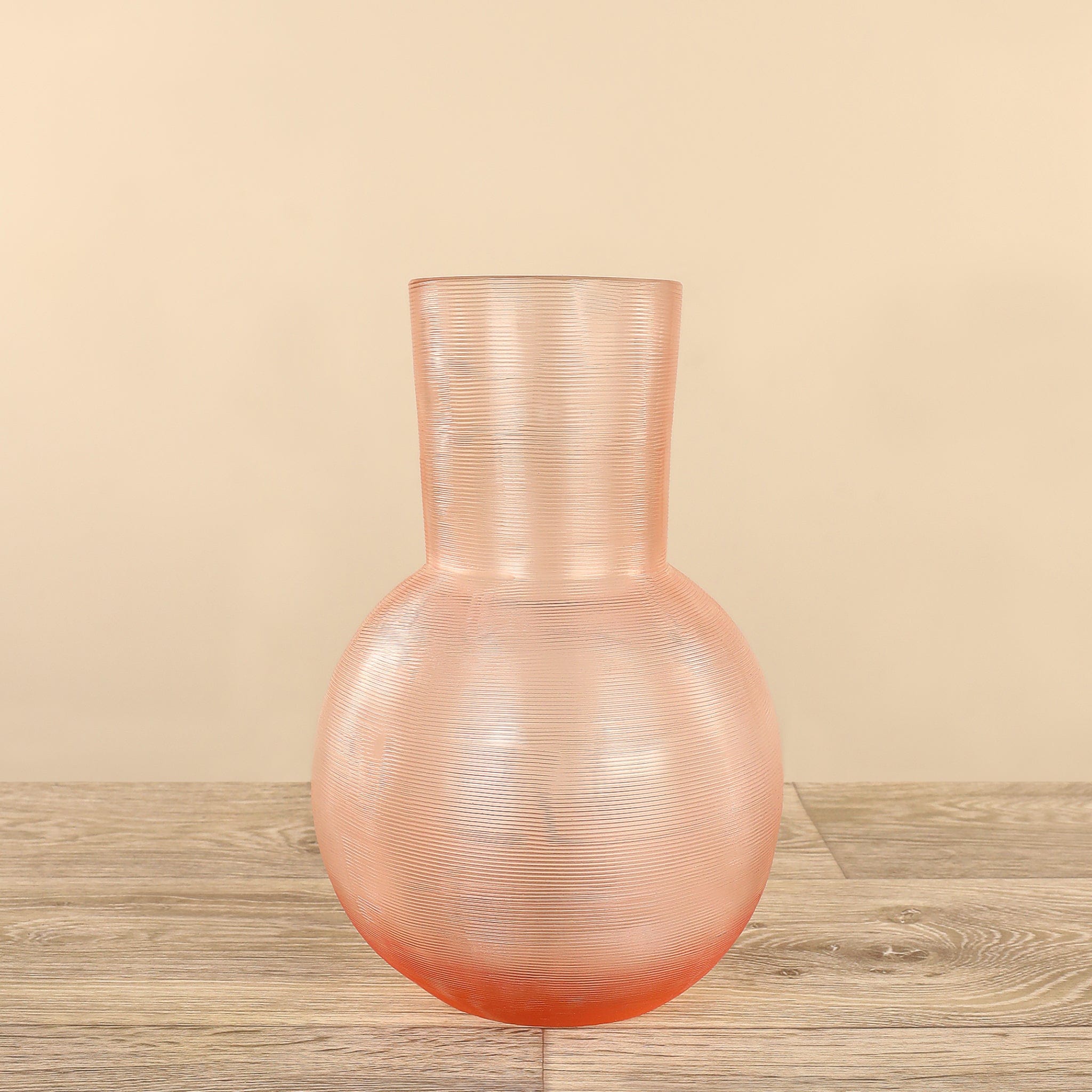 مزهرية زجاجية منفوخة ومصنوعة يدويًا بتصميم معاصر أنيق. تتميز بانحناءات ناعمة وحجم واسع يسمح بعرض تنسيقات زهور بأحجام مختلفة، أو بوضعها وحدها كقطعة زخرفية تبرز جمالها ولونها الوردي الباهت الجذاب.