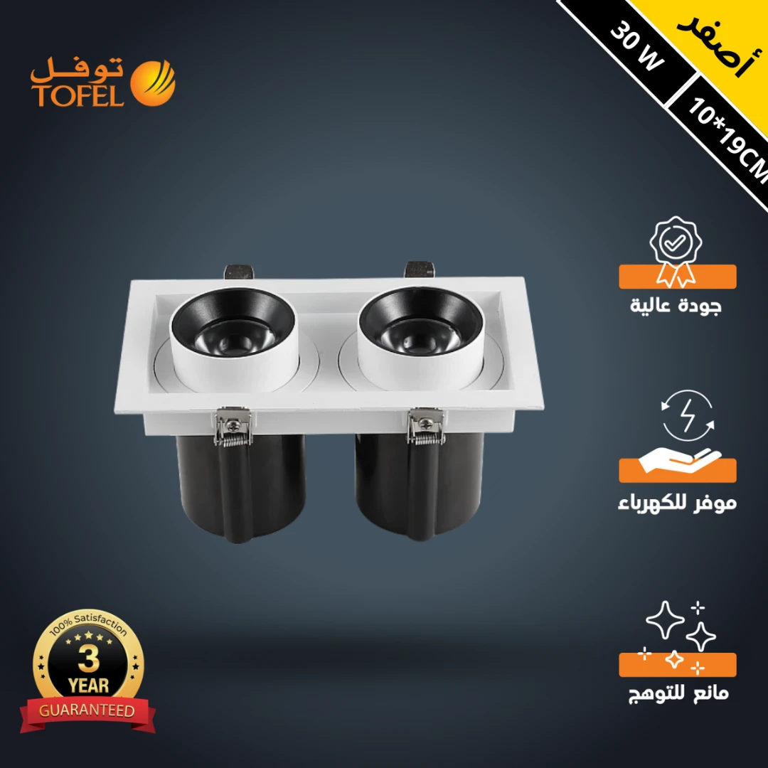 سبوت لايت مربع جسم أبيض وداخل أسود — إضاءة صفراء مضادة للتوهج، متحرك، 30 واط، 19×10 سم، توفل، مجوز