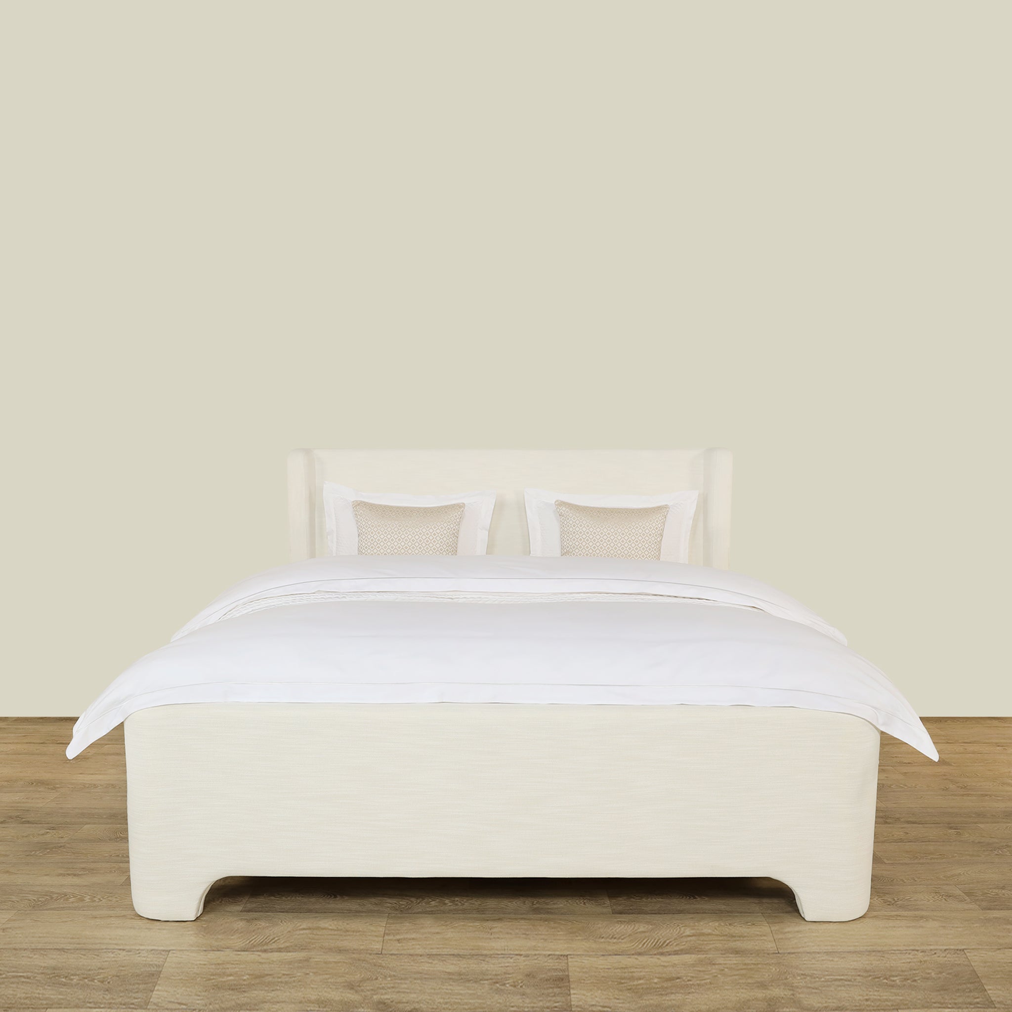 سرير يجمع بين الطابع الخالد والراحة المعاصرة، مصمم بإطار خشبي متين وتنجيد من قماش ناعم ليشكل قطعة مركزية أنيقة ومريحة في غرفة النوم.
