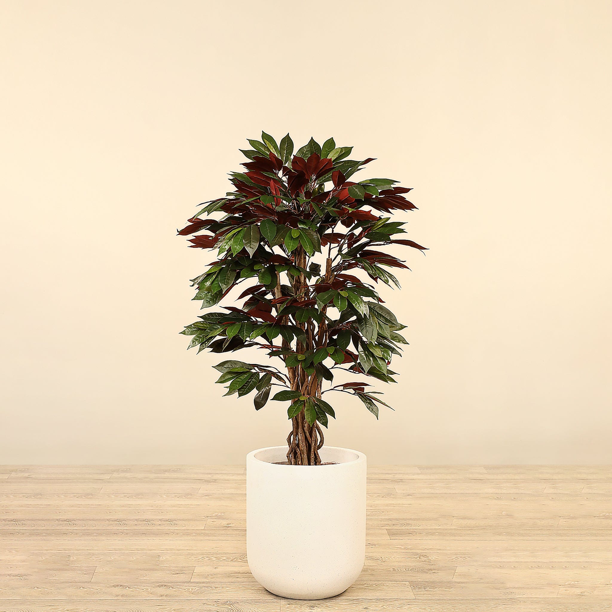 تمنحك هذه الشجرة الاصطناعية مظهرًا طبيعيًا وأنيقًا بدون عناء العناية. كل غصن رفيع مزدان بأوراق كثيفة تُضفي مظهرًا غنياً وحيويًا، بينما تكمل الجذوع المتشابكة الشكل العام وتمنحها إحساسًا واقعيًا ومتكاملًا — خيار مثالي لإضفاء لمسة خضراء على منزلك أو مكتبك بسهولة.