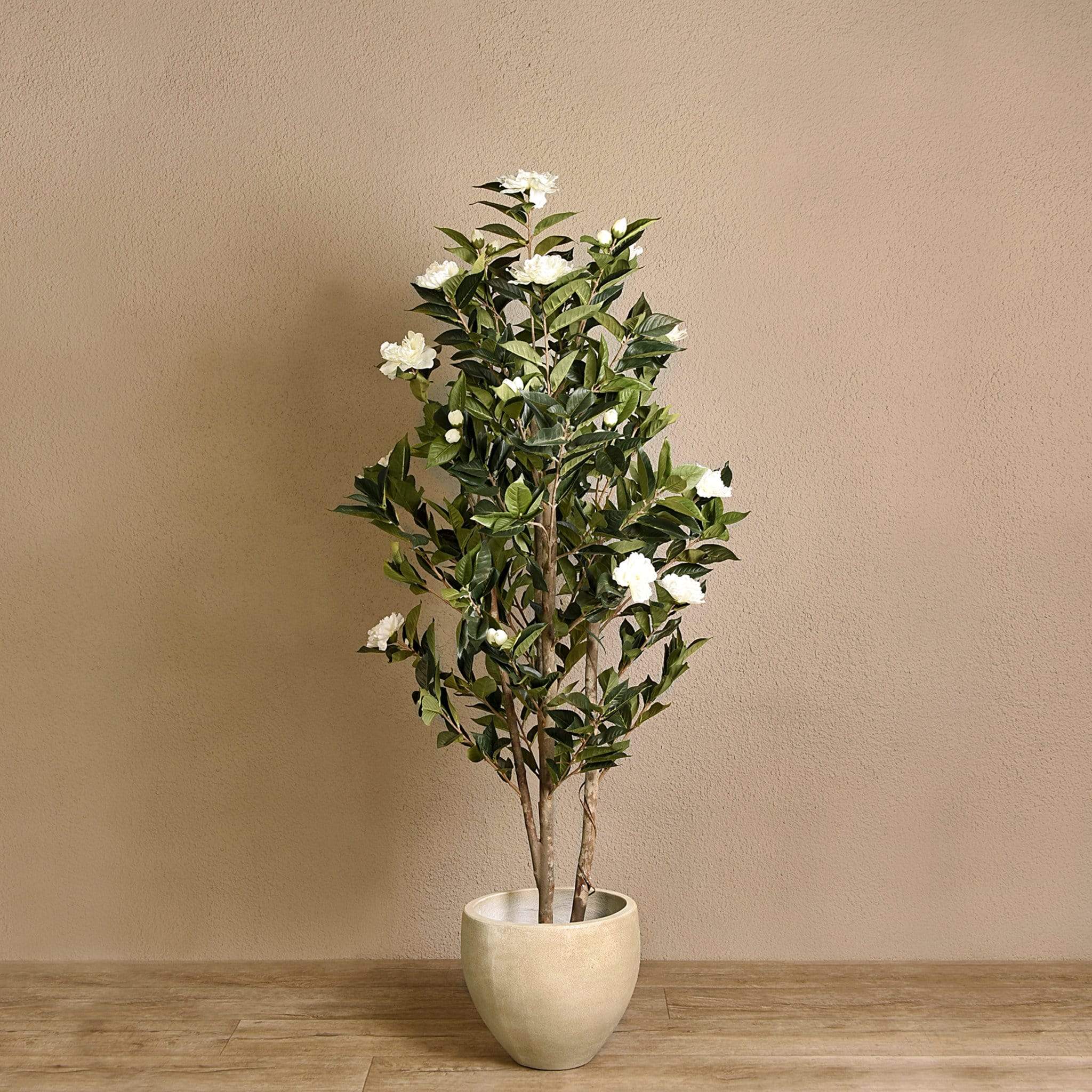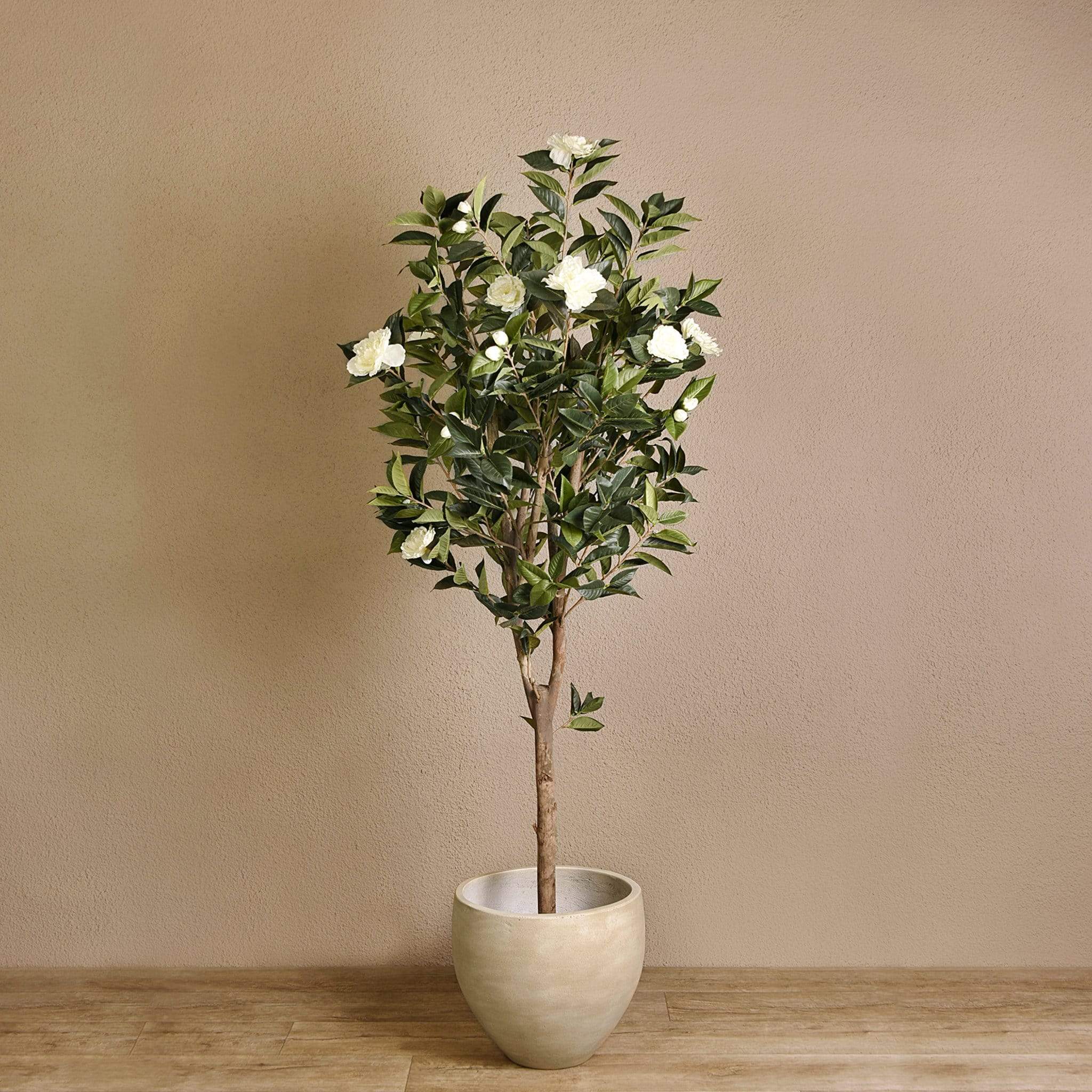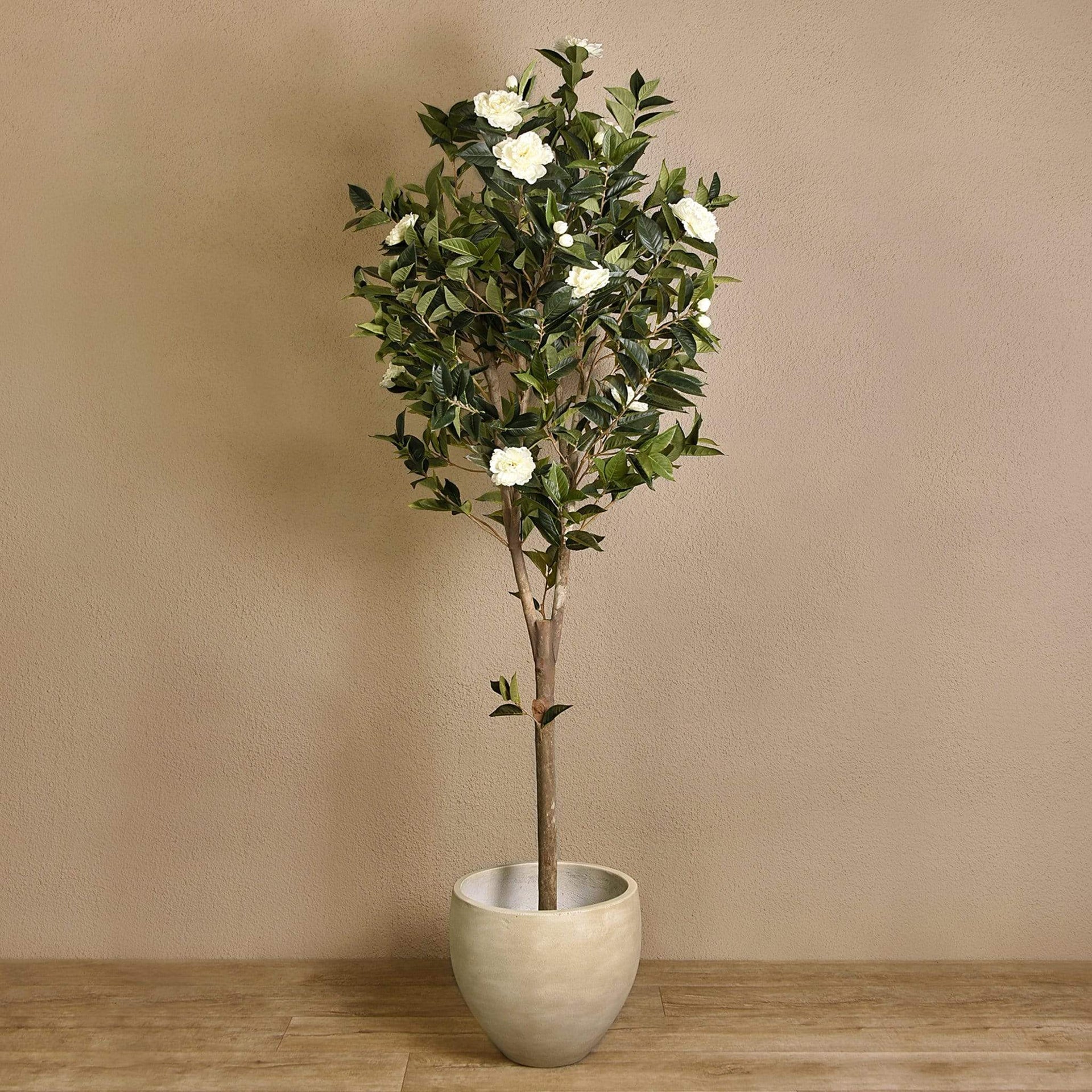 شجرة أنيقة مزينة بزهر الكاميليا الأبيض، تضفي دفء وأناقة على المنزل دون الحاجة إلى عناية مستمرة. تصميمها يحاكي الشكل والملمس الطبيعيين بدقة — من الجذع البني إلى الأوراق الخضراء الوارفة والزهور الرقيقة.