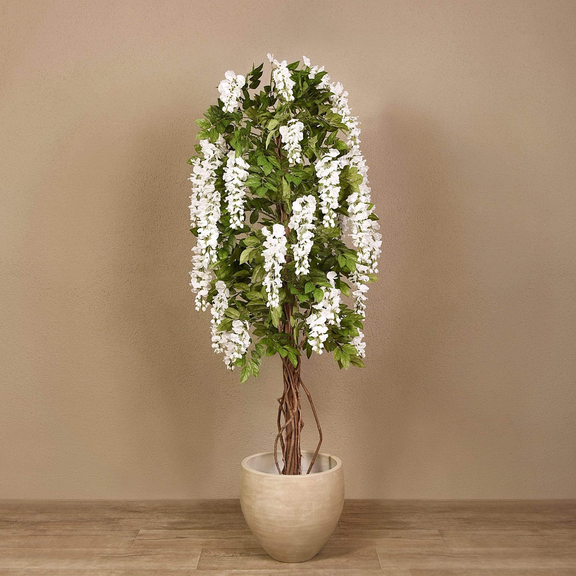 شجرة ويستريا صناعية ذات طابع رومانسي وهادئ تضيف لمسة حياة وأناقة إلى منزلك أو مكتبك. جذعها الشبيه بالكرمة، وأوراقها الخضراء، وأزهارها البيضاء تبدو طبيعية وواقعية بشكل ملحوظ. الشجرة مصممة بعناية ومتوّنة بالكامل—ما عليك سوى ثني الفروع وتثبيتها في إناء مزخرف لتصبح جاهزة لتزيين الغرفة.