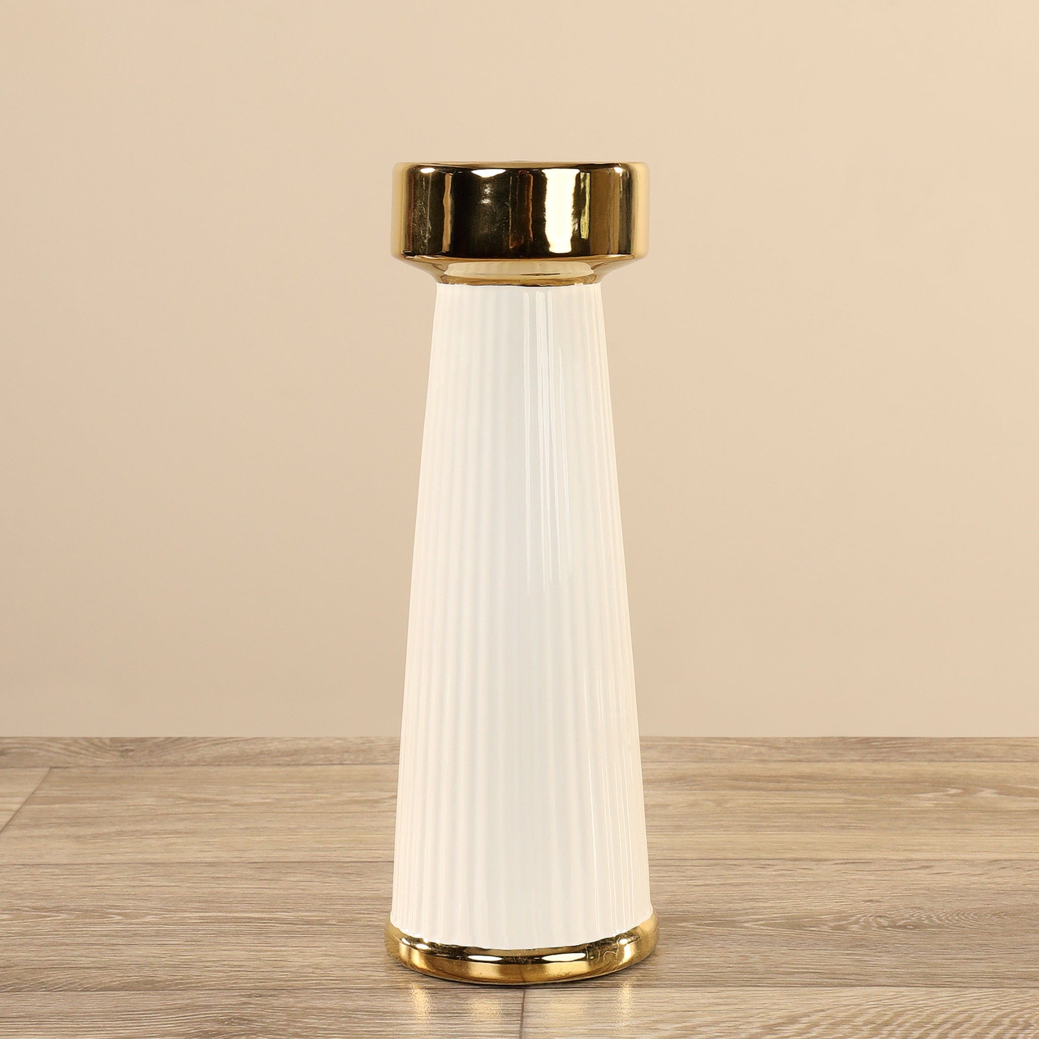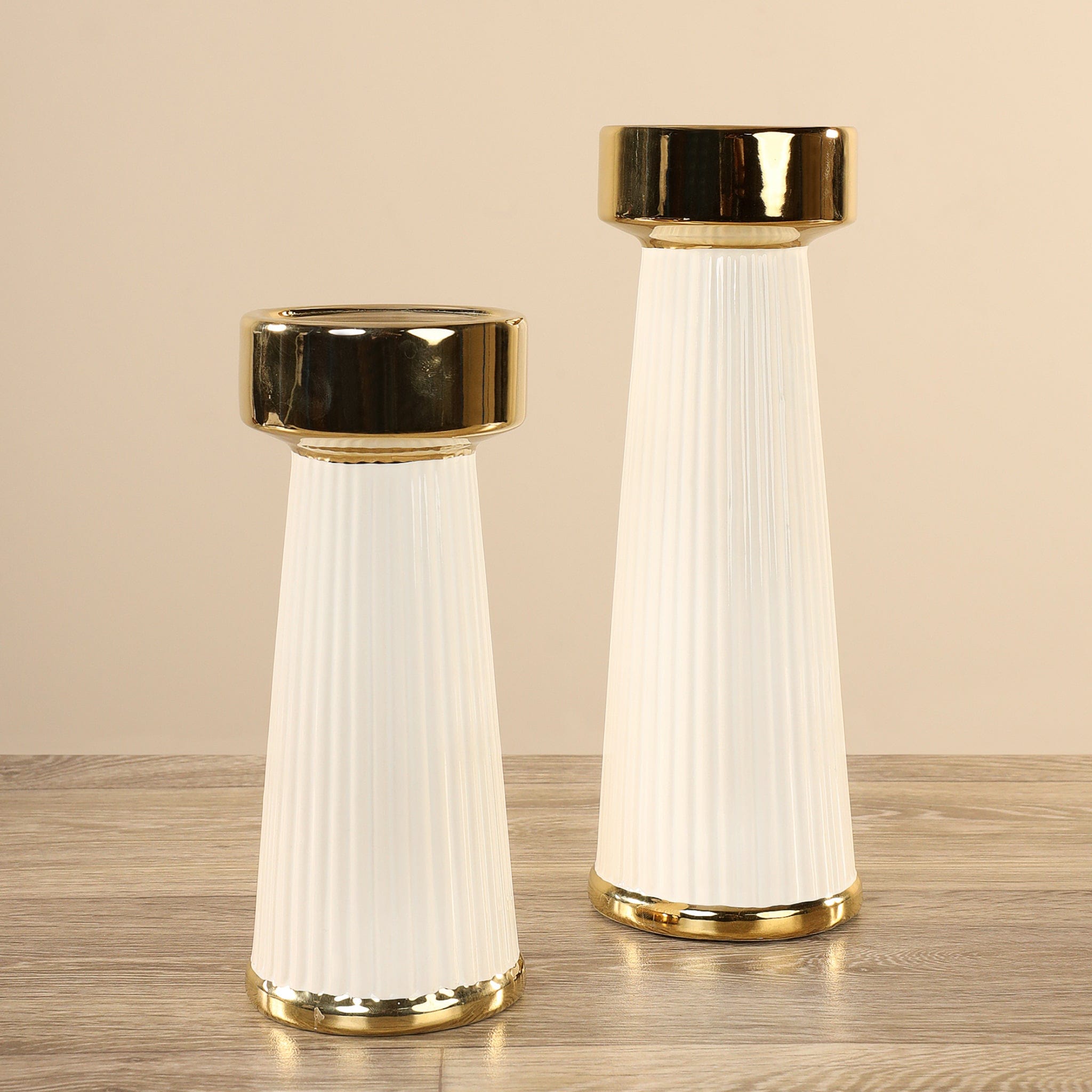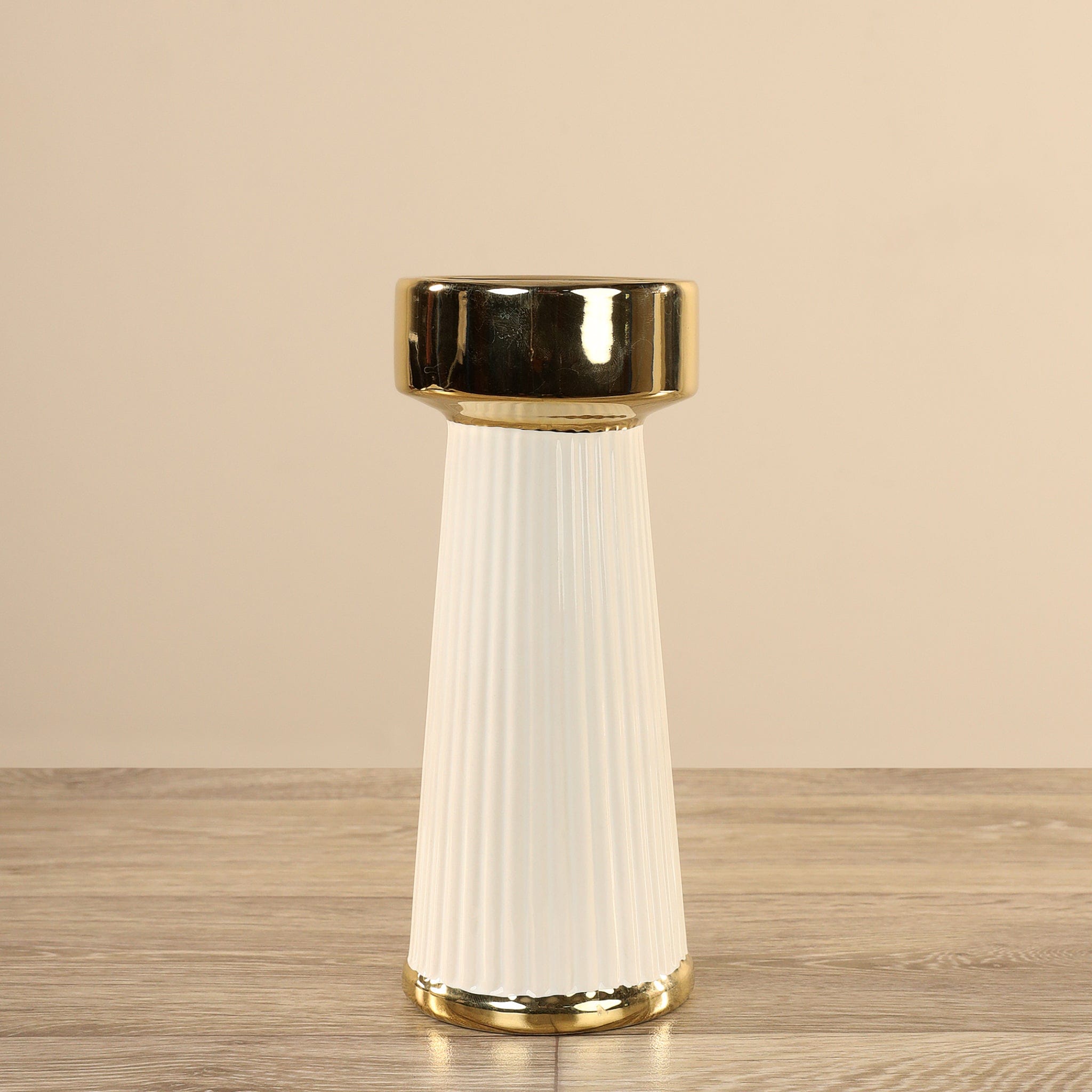 حامل شموع أنيق بلمسة لونية راقية تجمع بين الأبيض والذهبي، مصمم لإضافة جو دافئ وفاخر إلى أي مساحة داخلية.