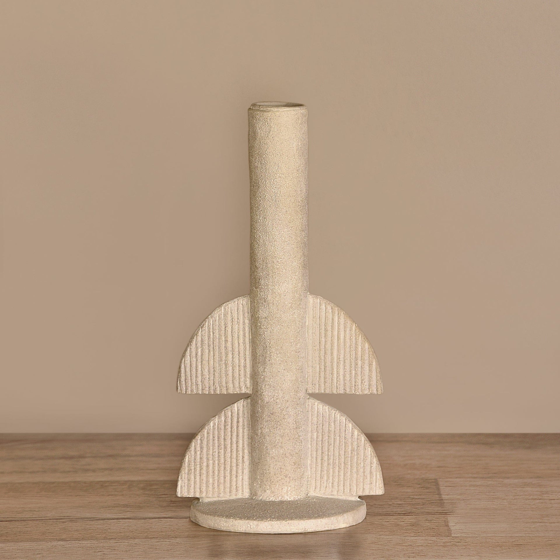 حامل شمع أنيق بلون أبيض شاحب، بحجم واحد ومقاسات واضحة تناسب الاستخدام المنزلي والديكور.