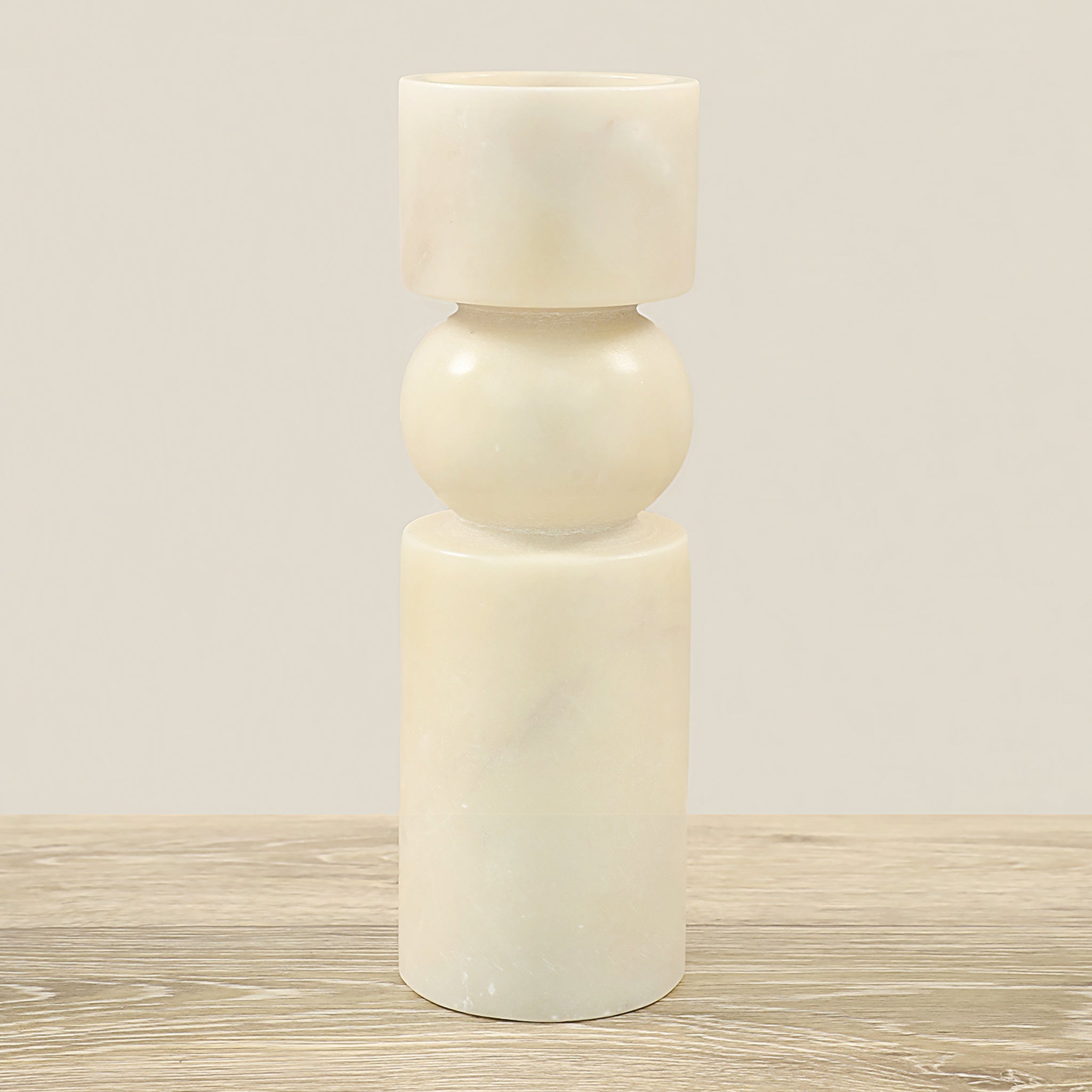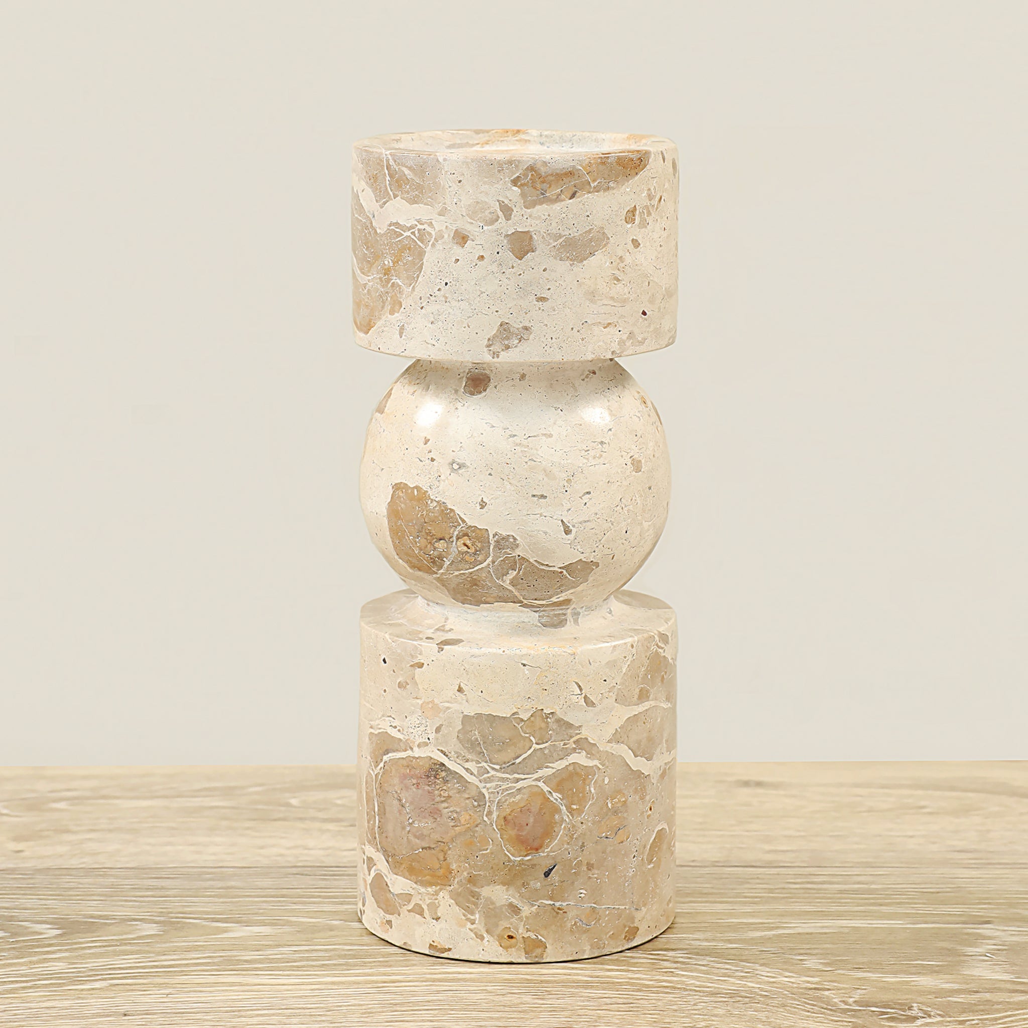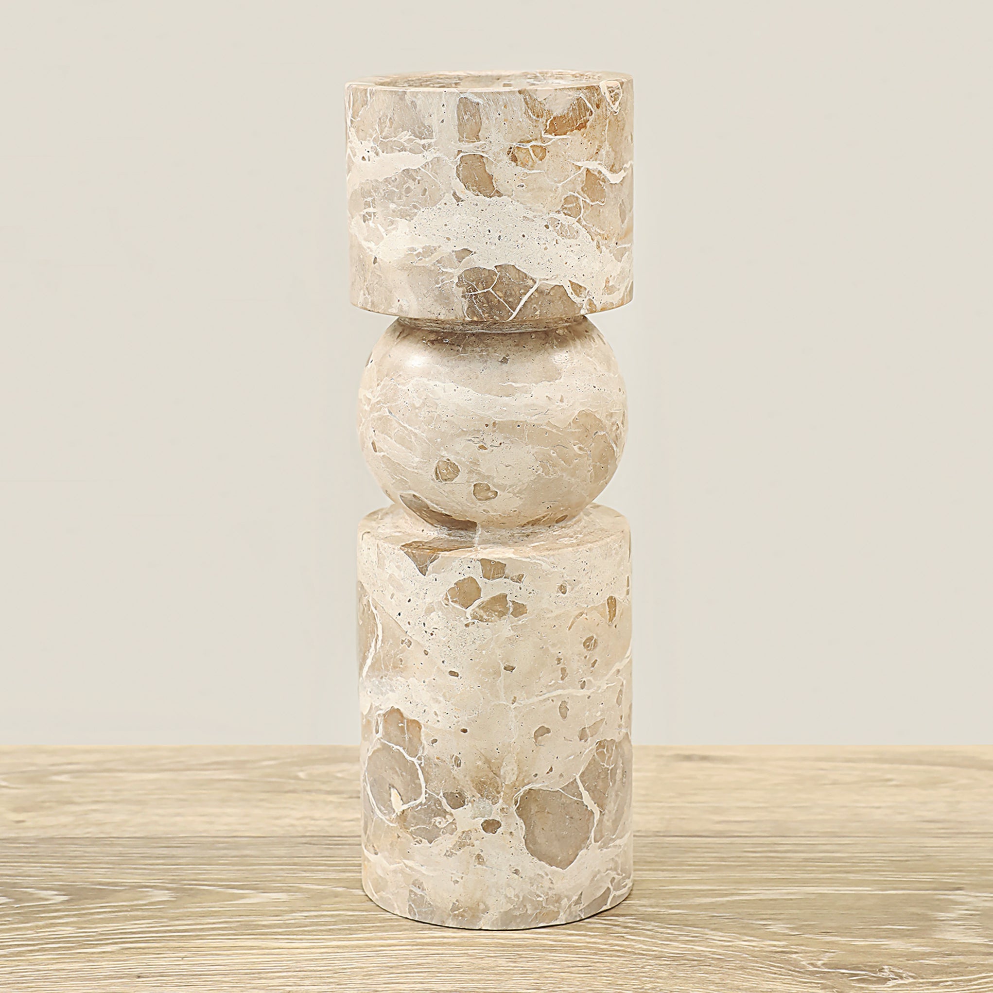 حامل شموع رخامي أنيق يجمع بين البساطة والفخامة. التشطيب اليدوي والعروق الطبيعية في الرخام يمنحانه طابعاً حرفياً ودفئاً بصرياً، ما يجعله قطعة ديكور متعددة الاستخدامات تضيف لمسة راقية لأي مساحة.
