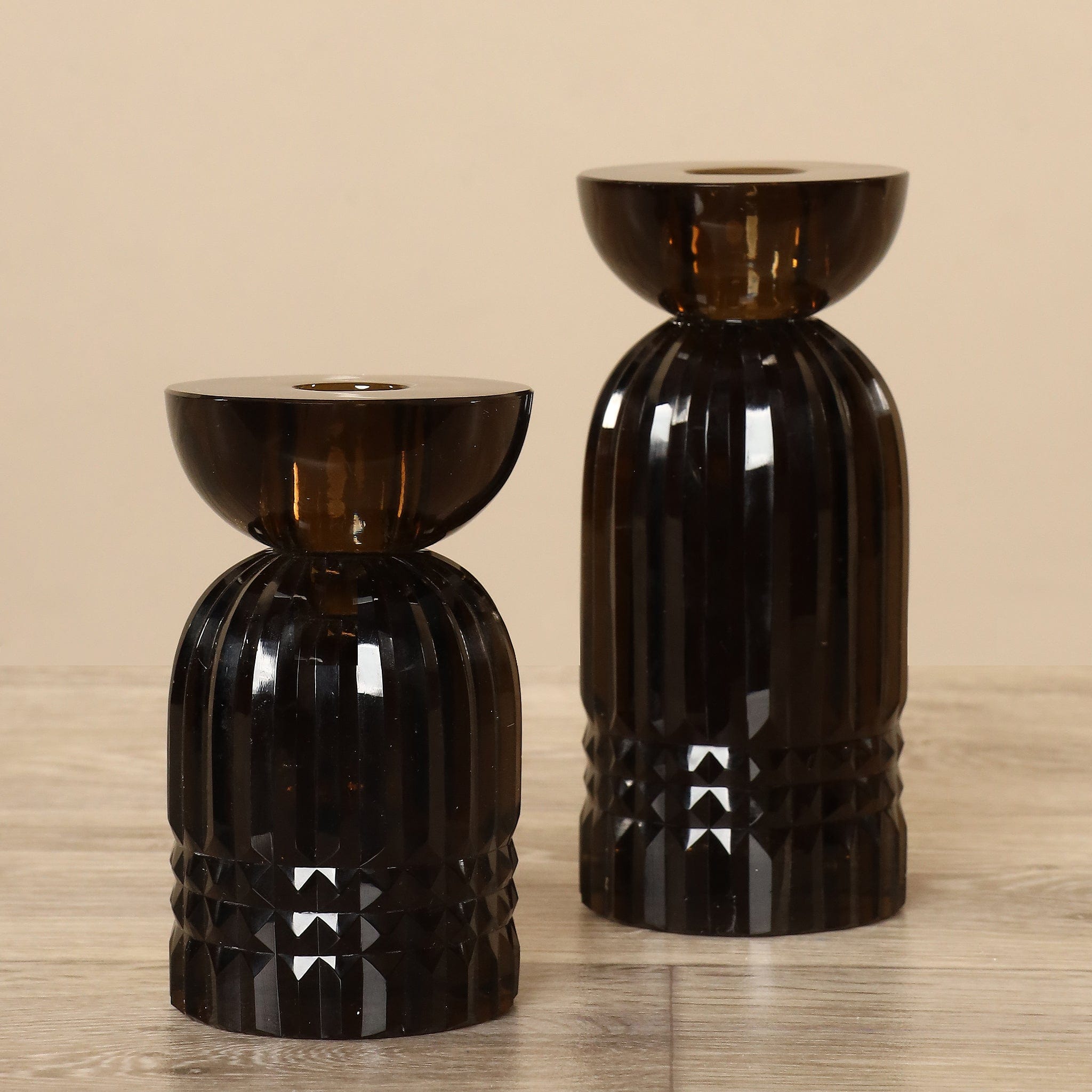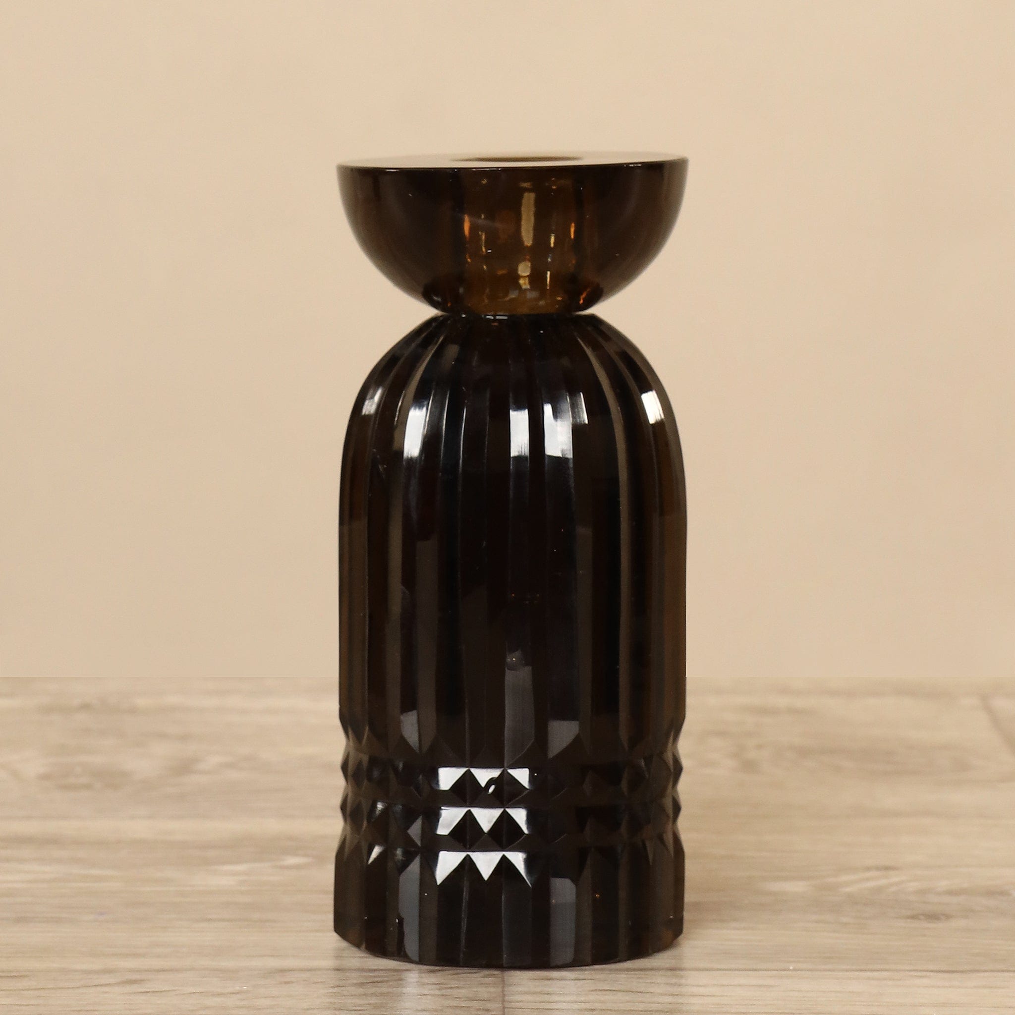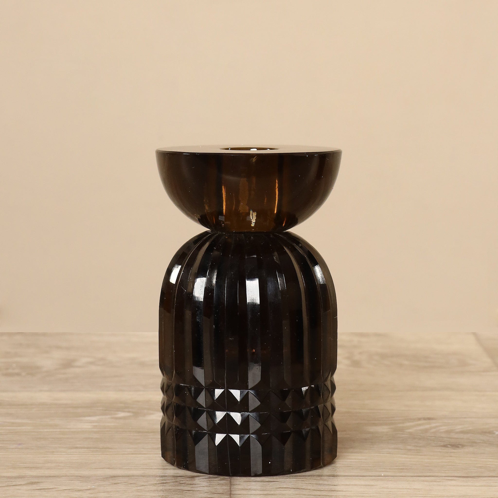 حامل شمع أنيق مصنوع من الزجاج الكهرماني يضفي دفئاً ورونقاً على أي مكان. تصميمه متعدد الأوجه يعكس الضوء بلطف، ما يمنحه جاذبية بصرية تجعله قطعة ديكور مرنة تناسب الطاولات العصرية والأجواء التقليدية على حدٍّ سواء.