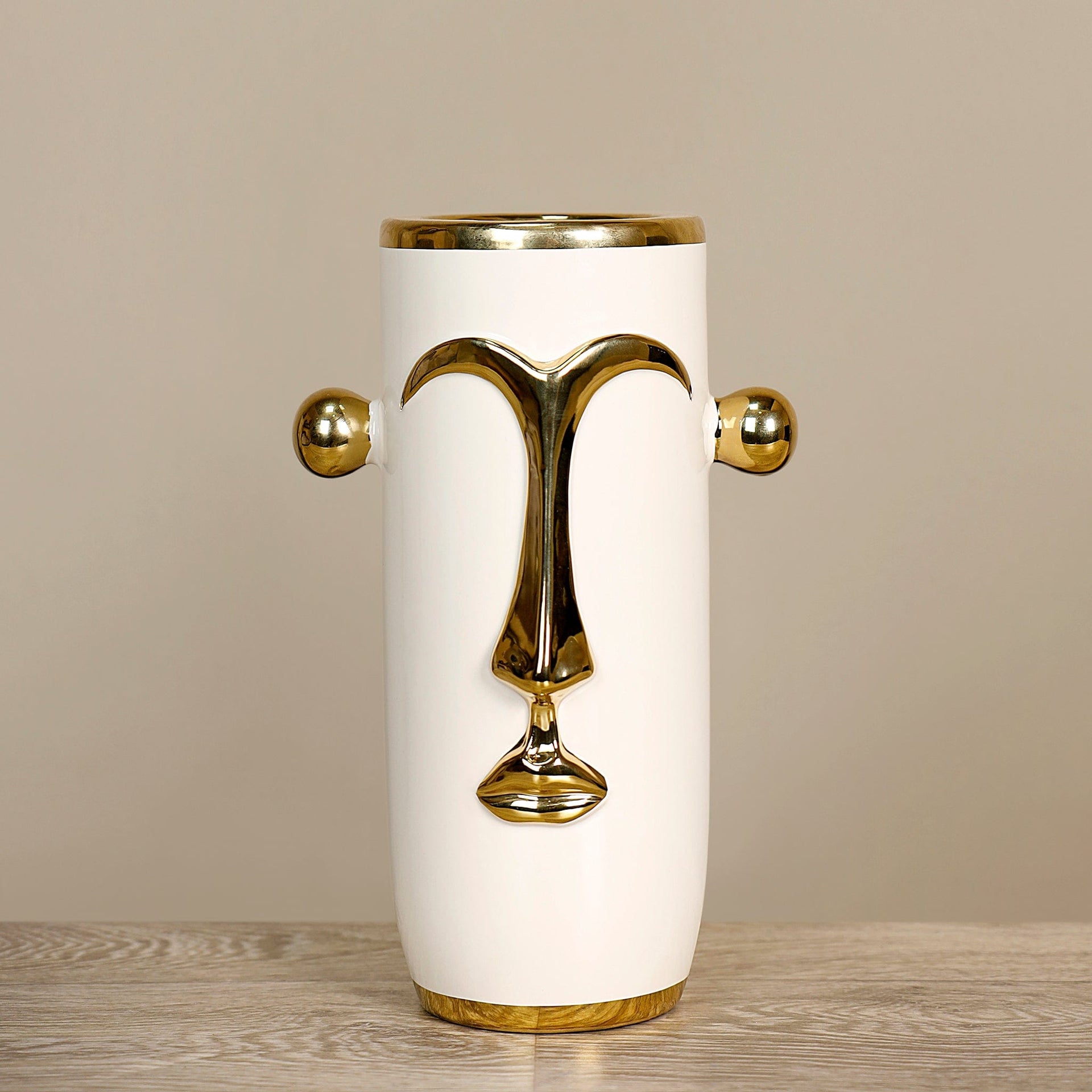 أضف لمسة من الأناقة والرفاهية إلى منزلك مع حامل الشموع الخزفي باللونين الأبيض والذهبي. تصميمه يجمع بين البساطة العصرية والتفاصيل الفاخرة ليصبح قطعة ديكور مميزة في أي مساحة.