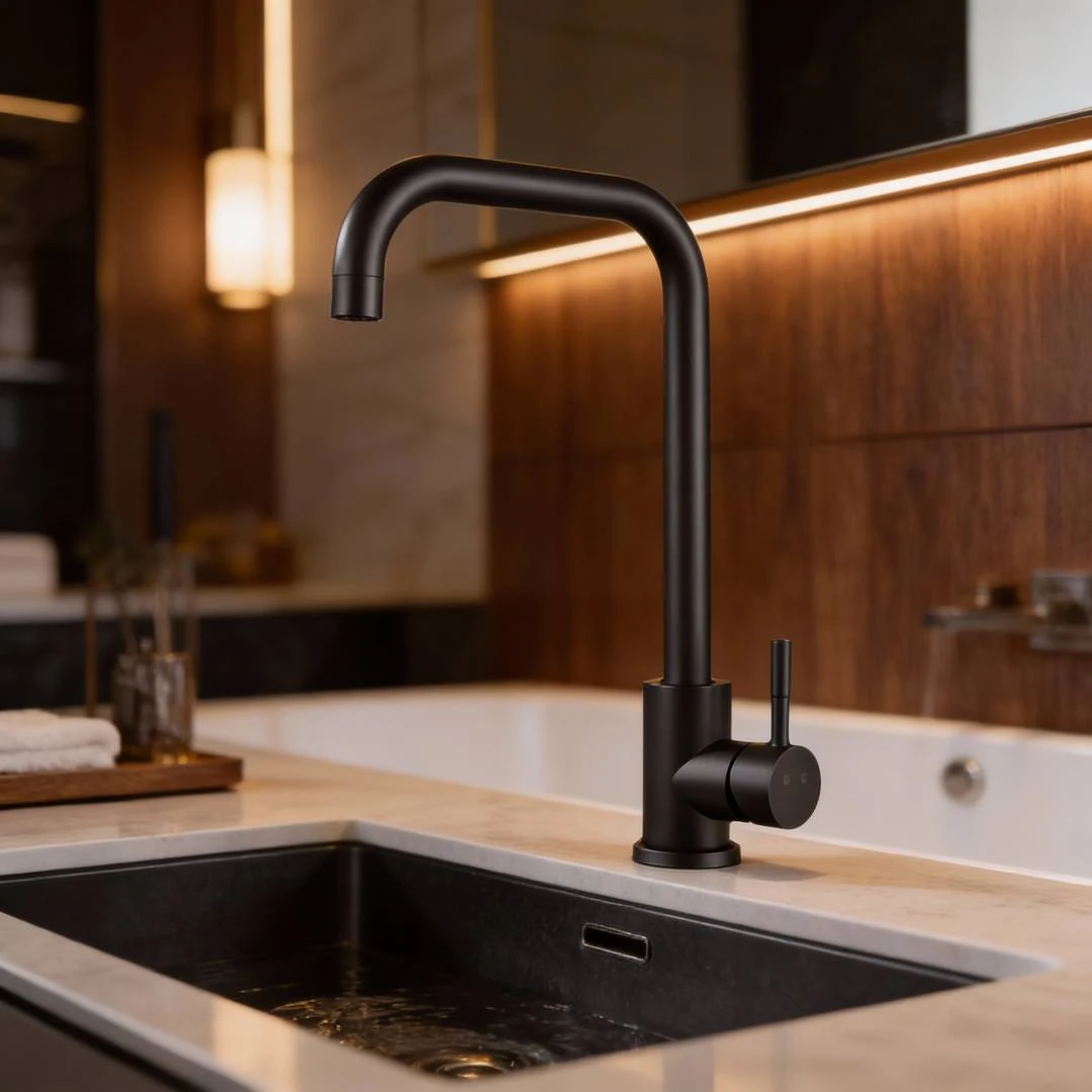 خلاط مجلى بتصميم مستقيم ومواد من الستانلس ستيل بلون رمادي أنيق، يوفر تحكماً دقيقاً بدرجة الحرارة والضغط. مناسب للمطابخ الحديثة ويأتي مزوداً بليات مرنة لتسهيل التركيب.
