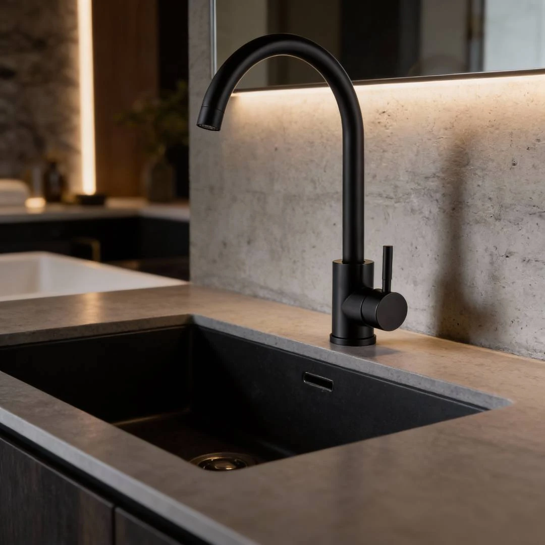خلاط مجلى أنيق يمنح حوض مطبخك مظهراً عصرياً وعملية سهلة في الاستخدام. تصميم مائل عملي ونظيف يناسب المطابخ الحديثة مع تشطيب أسود جذاب ومتين من الفولاذ المقاوم للصدأ.