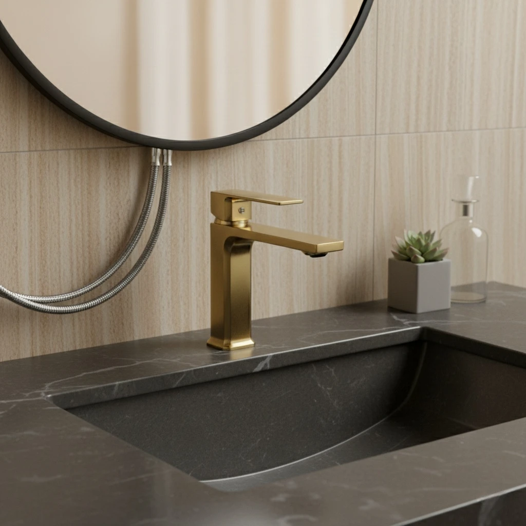 خلاط ذو تصميم هندسي مربع يضيف مظهراً راقياً للمغسلة مع ارتفاع قصير مناسب للمغاسل ذات الحافة المنخفضة أو المساحات المدمجة. الطلاء الذهبي المطفي مقاوم للبقع ويسهل الحفاظ عليه، والليات المرفقة تسهل التركيب والتوصيل بنظام الإمداد بالماء.
