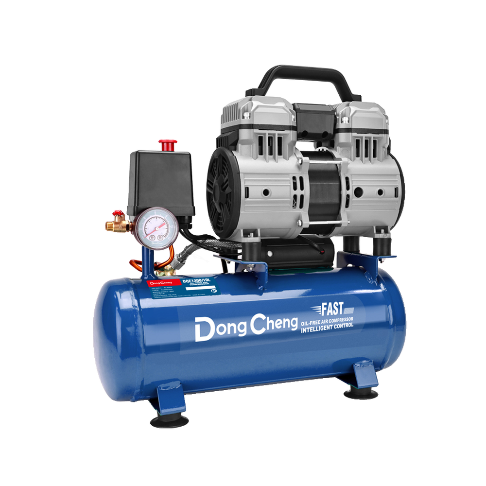 ضاغط هواء من شركة Dong Cheng بسعة خزان 10 لترات وتصميم خالٍ من الزيت، موجه للورش المنزلية أو الورش الصغيرة والأعمال الخفيفة إلى المتوسطة مثل النفخ، التنظيف، رشّ طلاء صغير، وصيانة خفيفة.