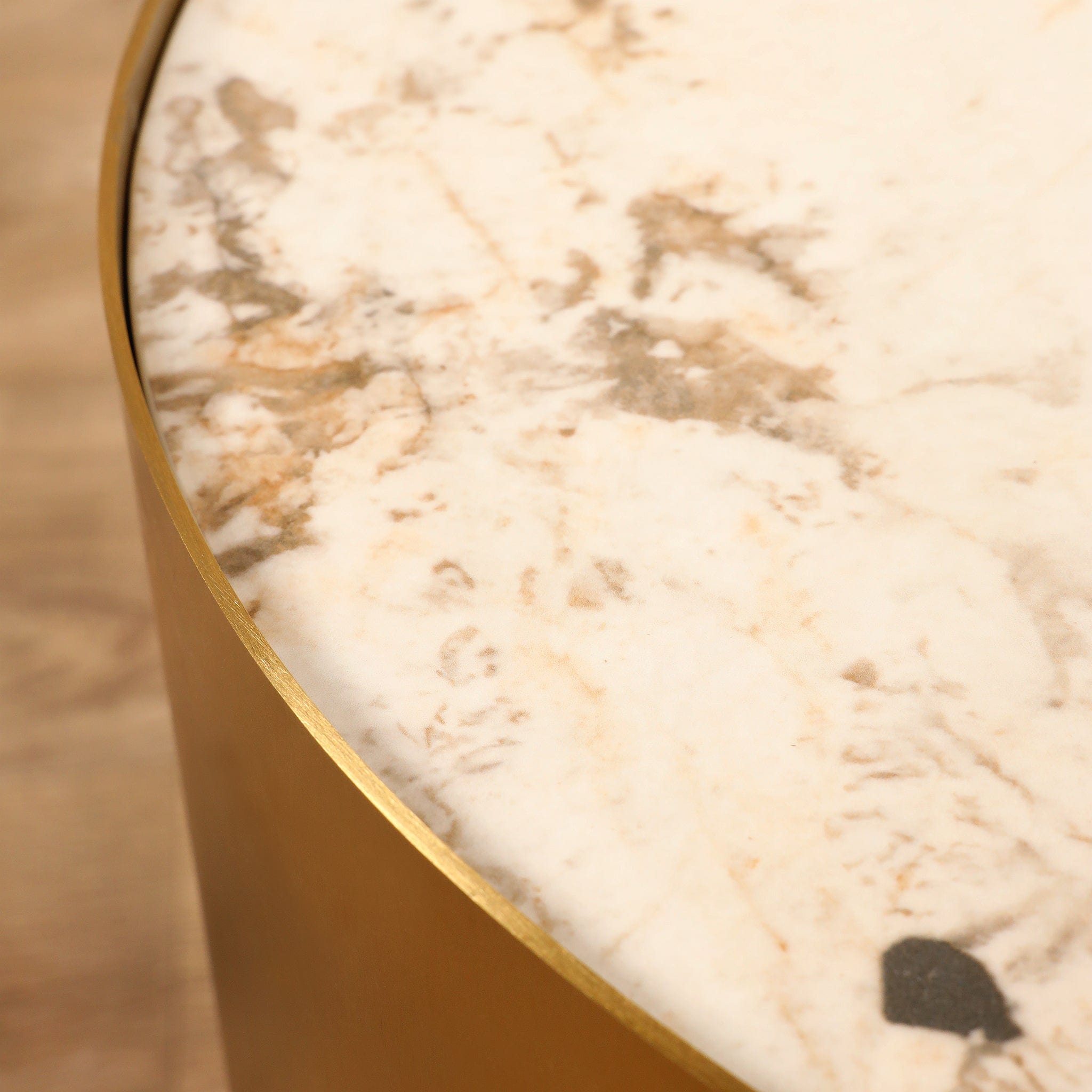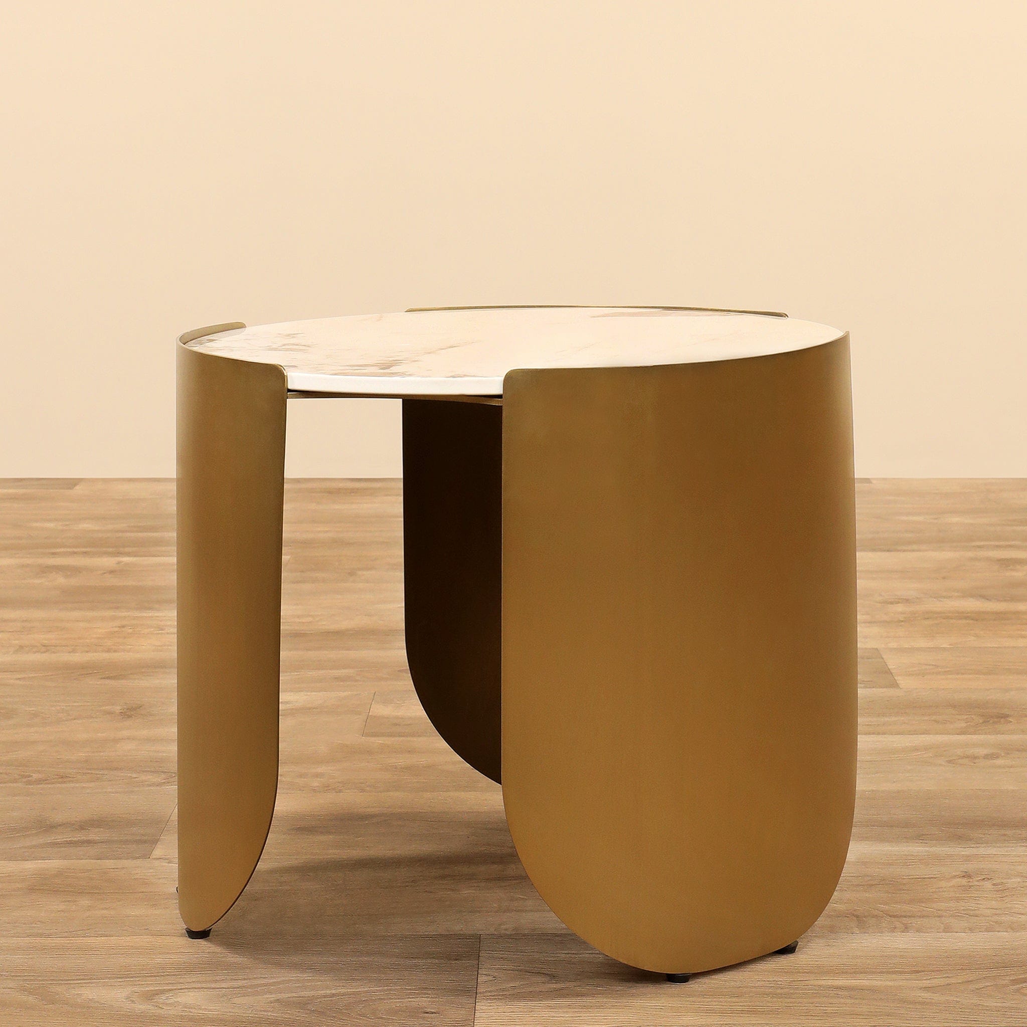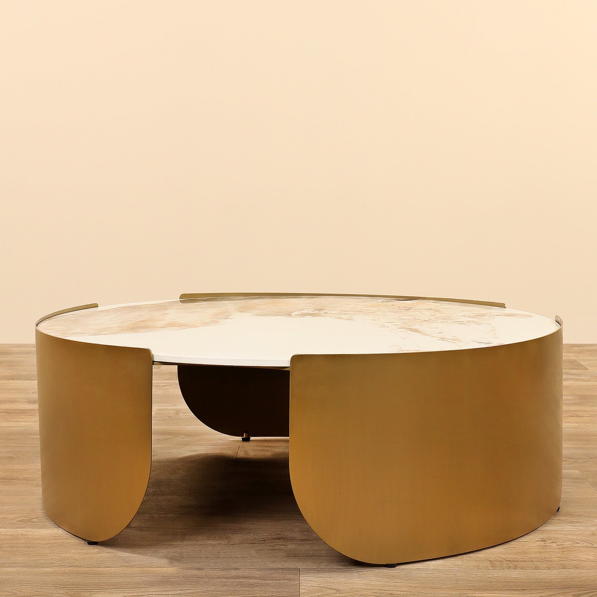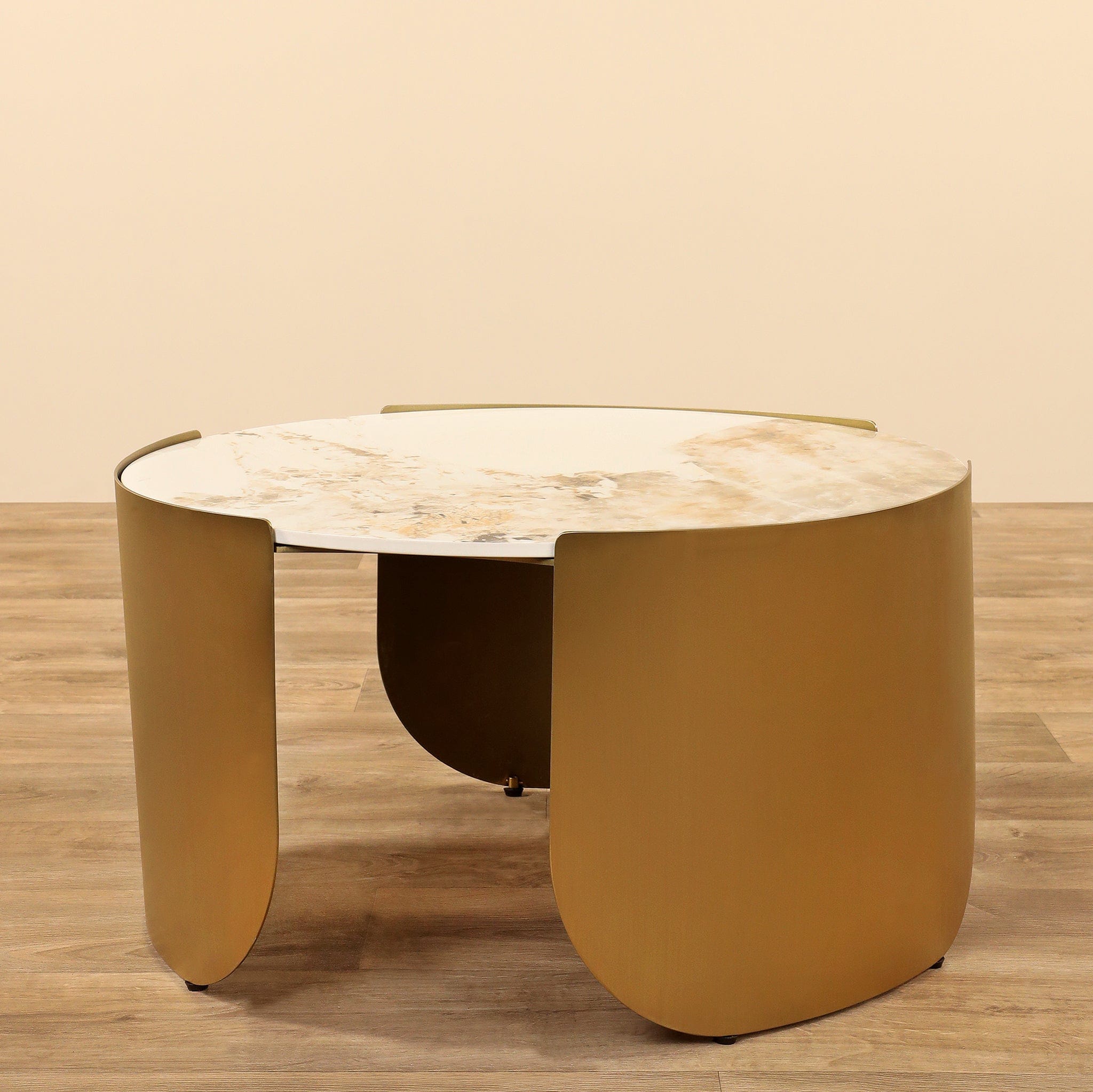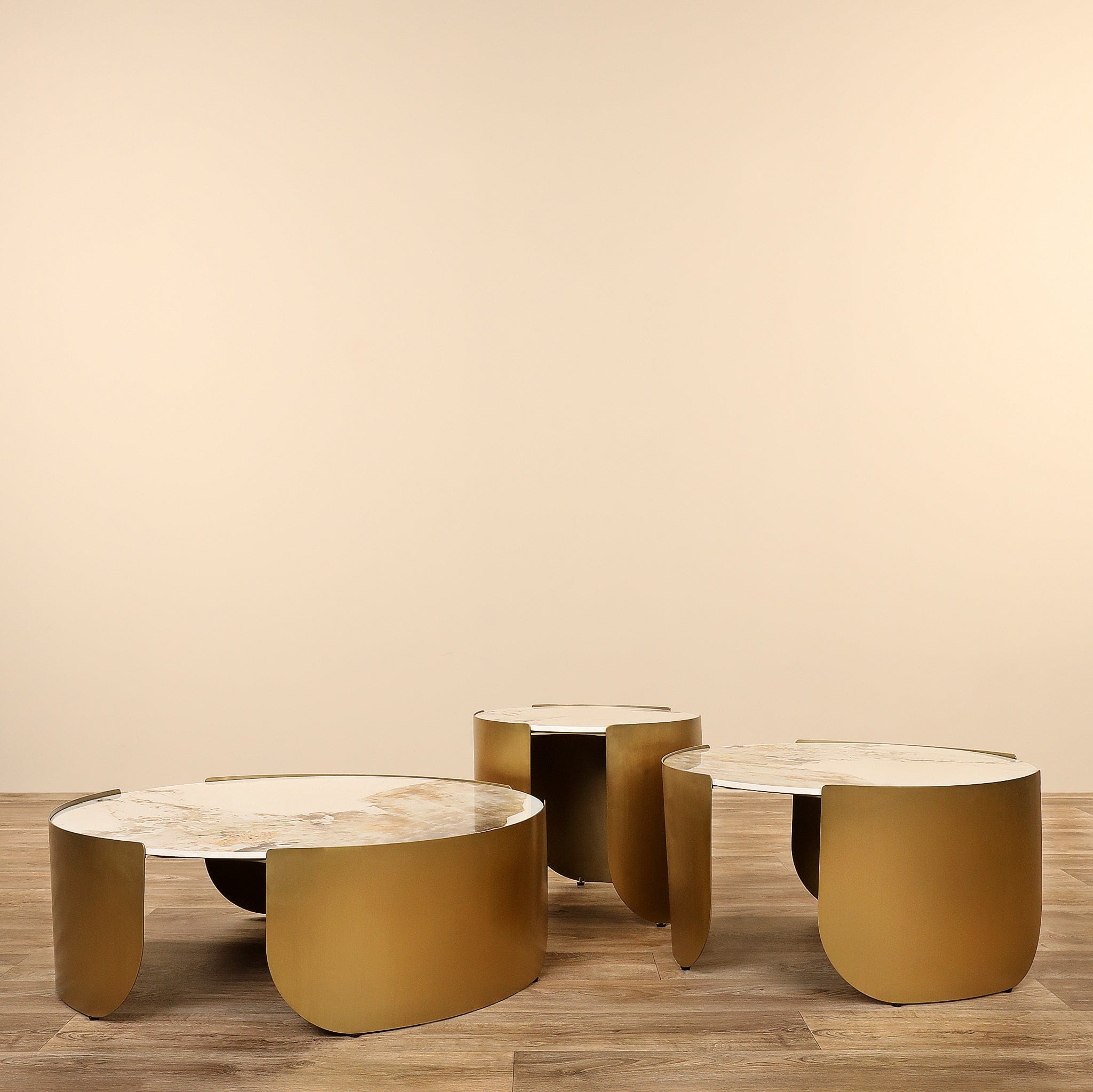 طقم طاولات أنيقة متعددة الأحجام تناسب الاستخدام كطاولة جانبية أو طاولة قهوة. قاعدة من الفولاذ المقاوم للصدأ مطلية باللون الذهبي مع سطح من الحجر المتكلس، تصميم عملي وجمالي يوفر تدرجًا في الارتفاع لسهولة التنسيق داخل غرفة المعيشة.
