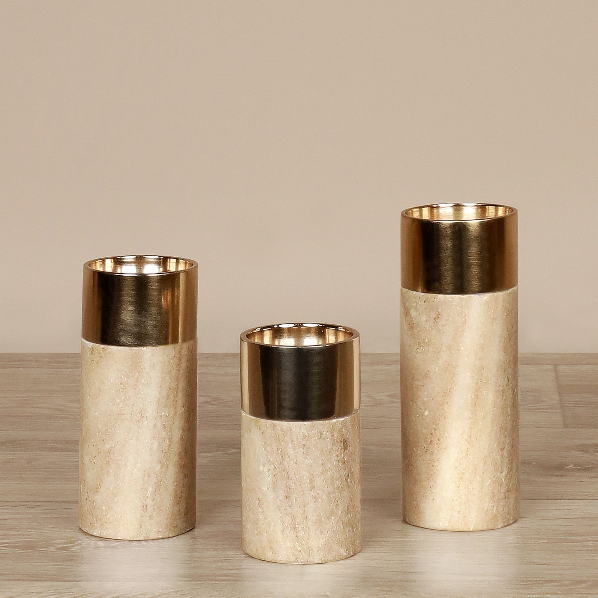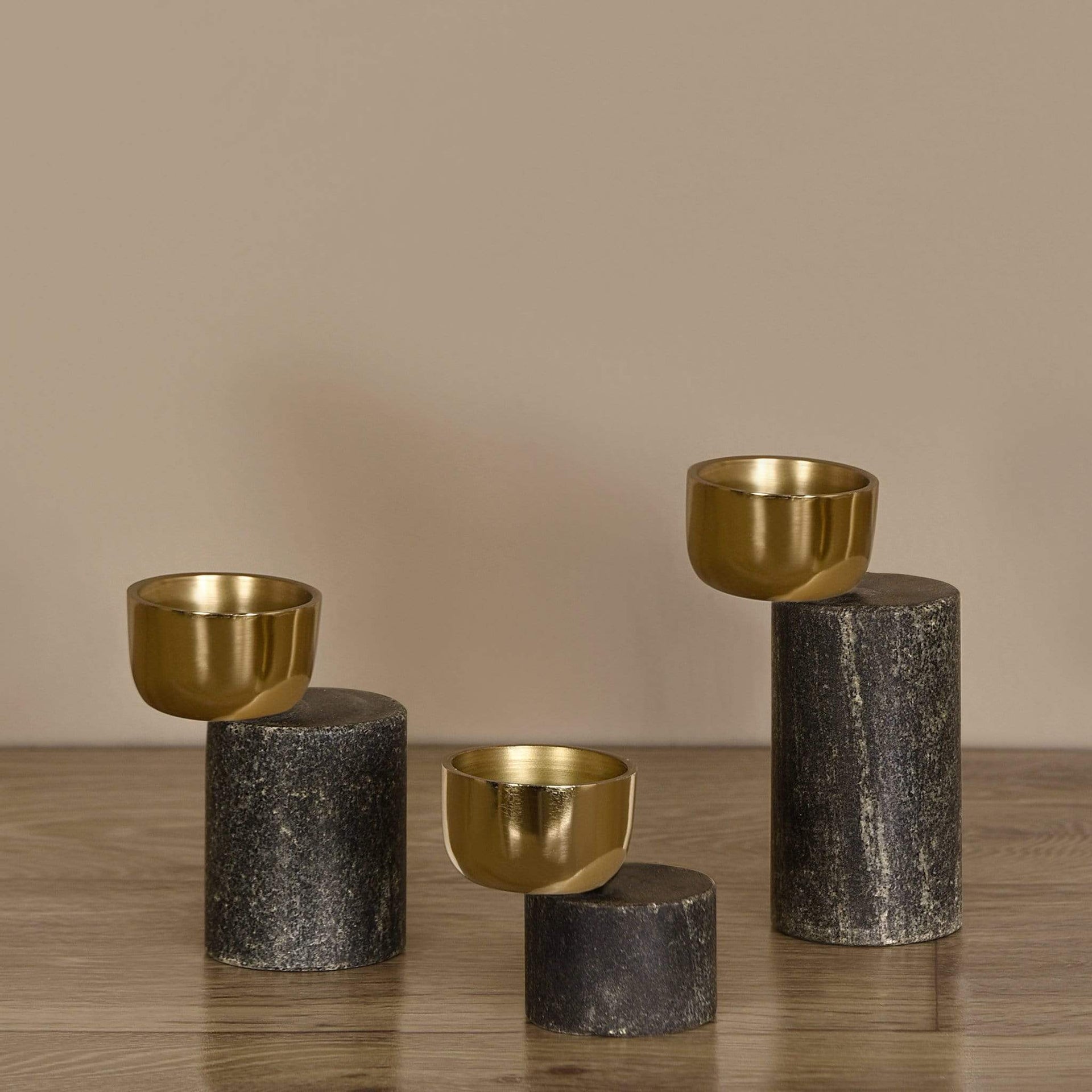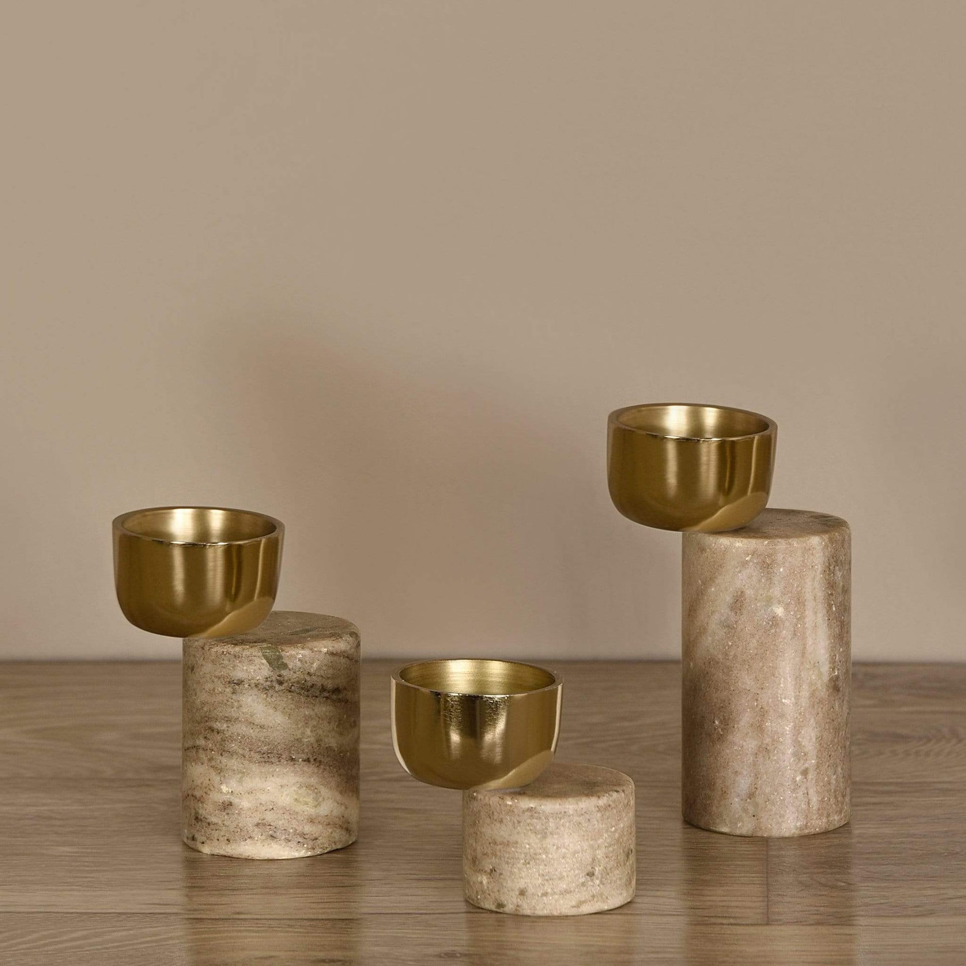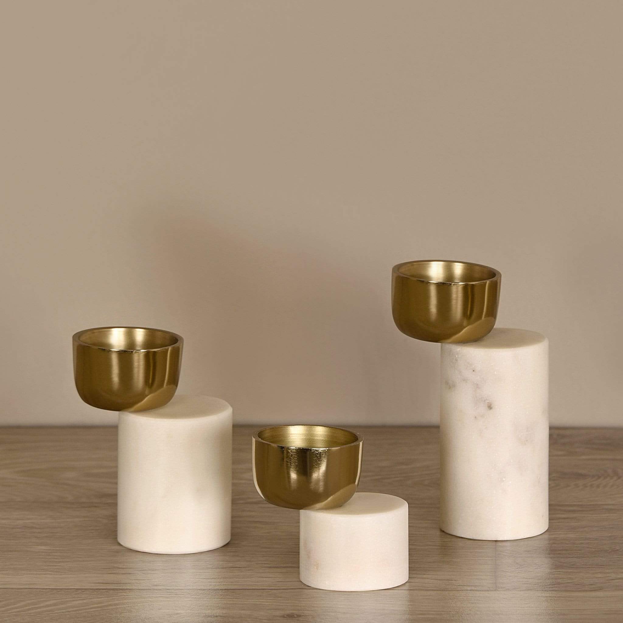 طقم أنيق من حوامل الشموع بتصميم يجمع بين الرخام الفاخر والتشطيب الذهبي للنحاس الأصفر، مناسب لتزيين المنزل أو كهدية مميزة.