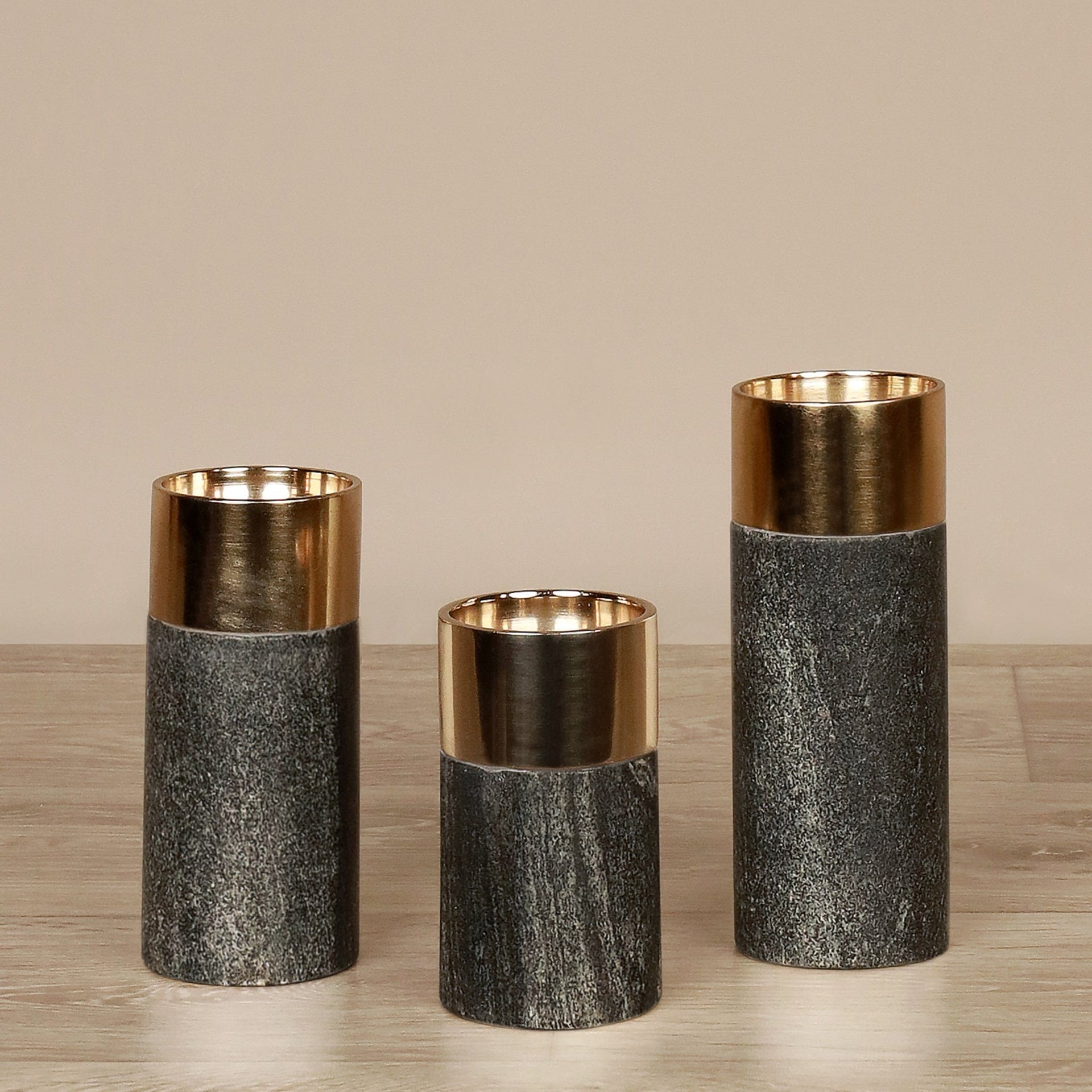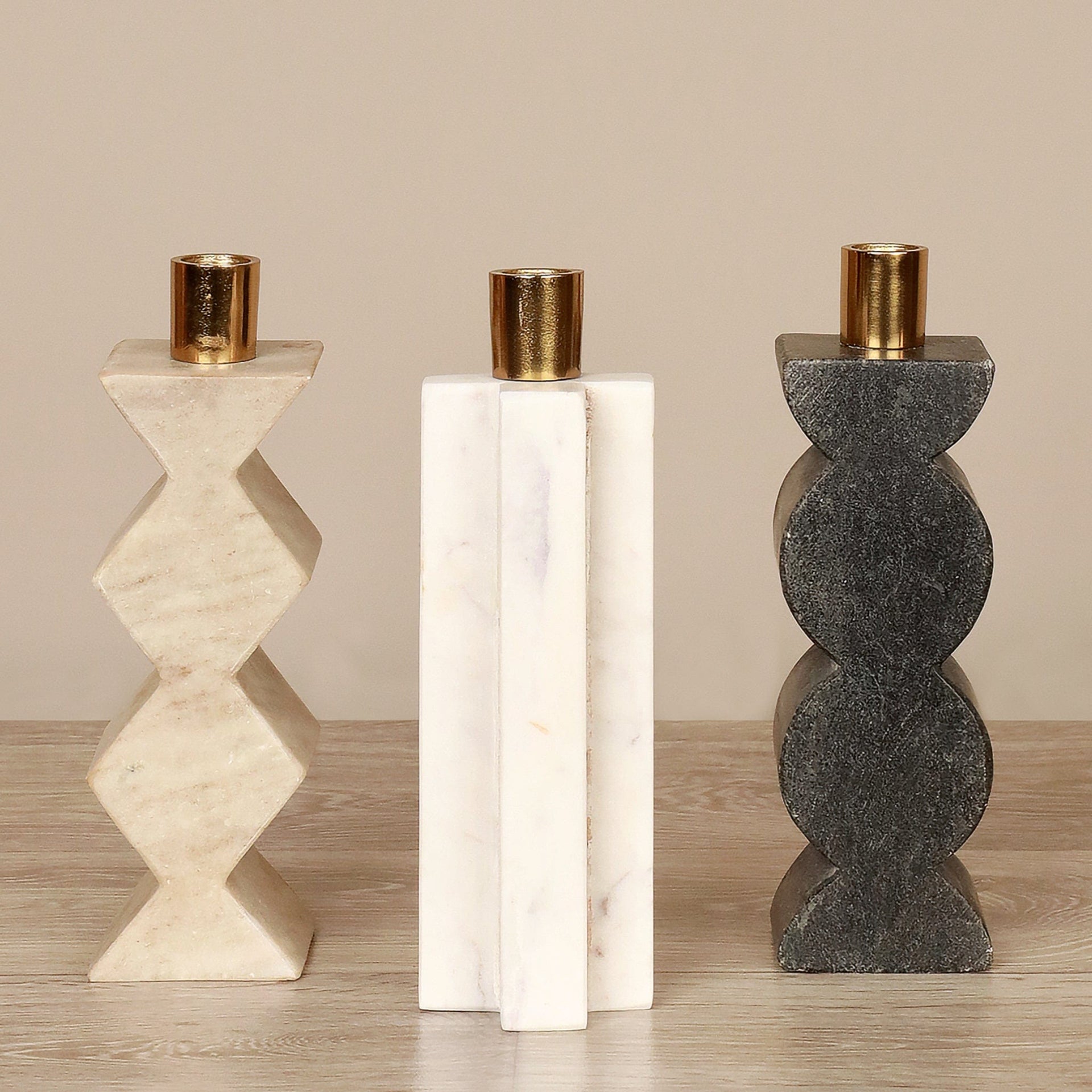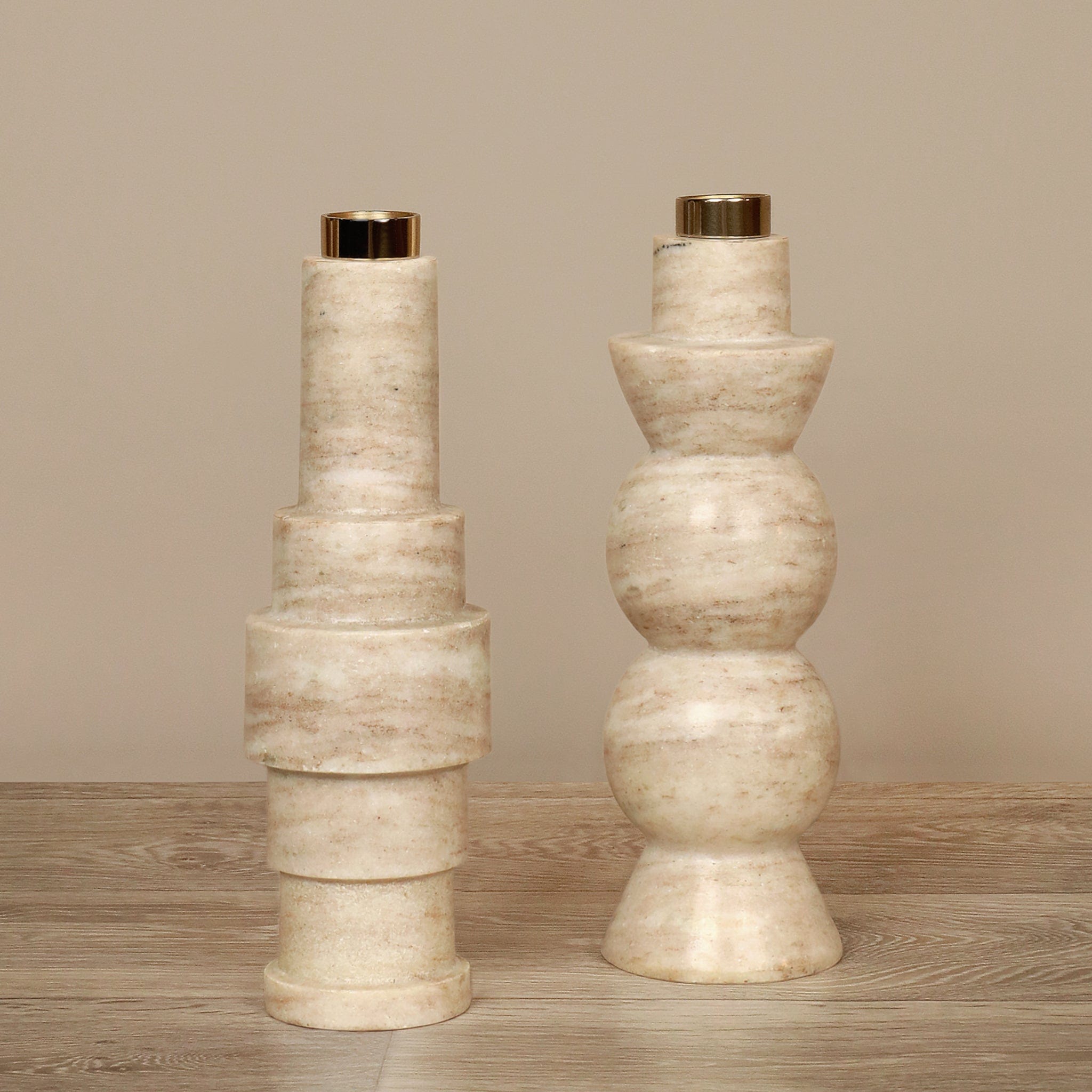 طقم أنيق وعصري من حوامل الشموع يصنع مزيجاً بين رونق الرخام وصلابة المعدن، مناسب لتمييز ديكور المنزل أو كهدية راقية.
