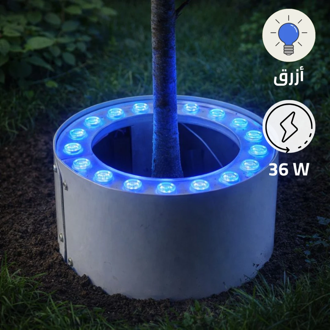 كشاف خارجي دائري مخصص لإضاءة الأشجار والحدائق، يوفر إضاءة زرقاء نقية ومحددة حول جذع الشجرة بفضل تصميمه الدائري وفتحة التثبيت الداخلية. مثالي لإضافة لمسة جمالية ليلية للمساحات الخارجية والحدائق.