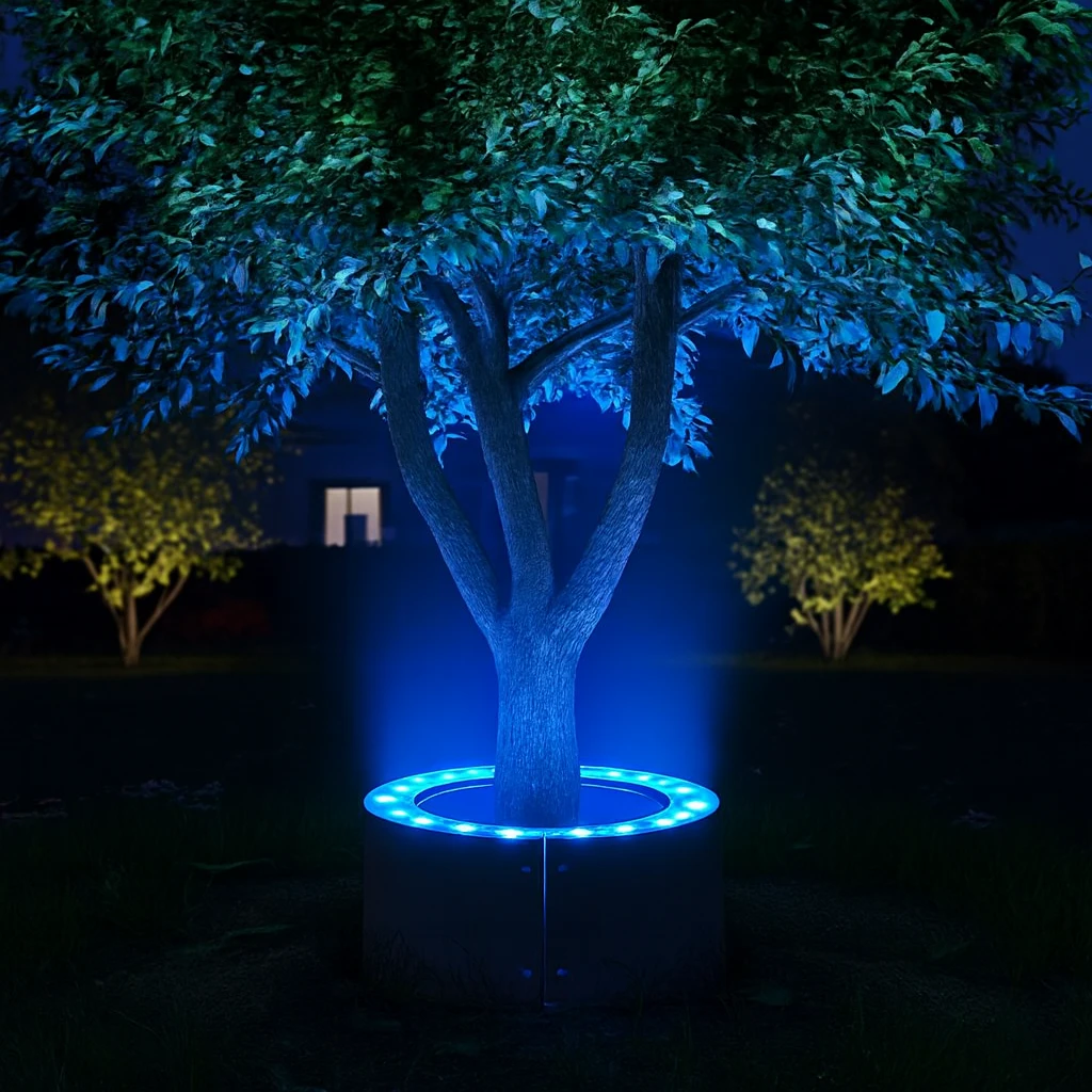 كشاف خارجي مصمم خصيصًا لإنارة الأشجار والمساحات الخارجية الصغيرة. يأتي على شكل حلقة دائرية بقطر داخلي مناسب لاحتضان جذع الشجرة وقطر خارجي يغطي الهيكل الكامل للكشاف، ويصدر ضوءًا أزرقًا نقيًا يضفي جوًا جماليًا على الحديقة أو الفناء.