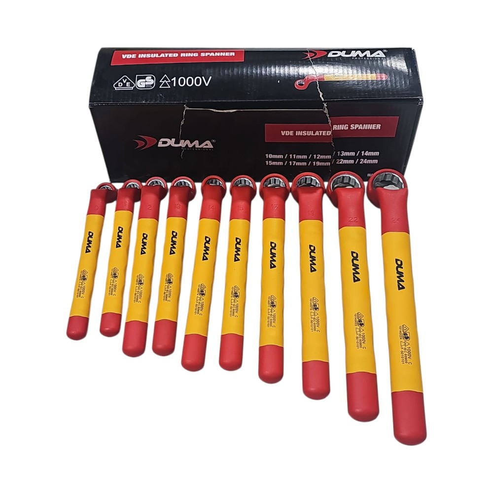 طقم مفاتيح مختومة ومعزولة من شركة DUAM، مصمّم للعمل الآمن والدقيق على التركيبات الكهربائية. يغطي الطقم مقاسات من 10 مم حتى 24 مم، ويجمع بين متانة المفاتيح وقدرة العزل الكهربائي ليكون مناسباً للفنيين والهاوين الذين يعملون على لوحات ومعدات كهربائية (بعد قطع التغذية).