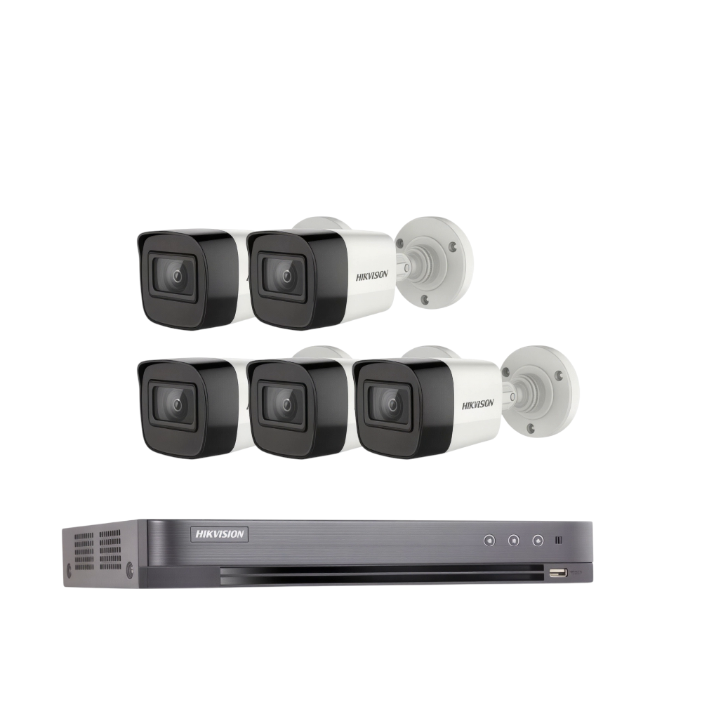 - 5 كاميرات مراقبة Hikvision بدقة 8MP (قابلة للاستخدام داخلياً وخارجياً)