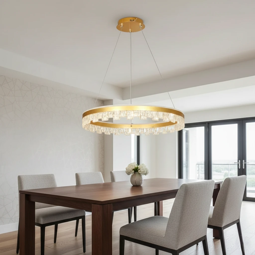 ثريا مودرن بخطوط بسيطة وخفيفة تناسب المساحات الصغيرة، تجمع بين لمسة ذهبية أنيقة وإضاءة LED متعددة لتجديد أجواء المكان وإبراز تفاصيله.