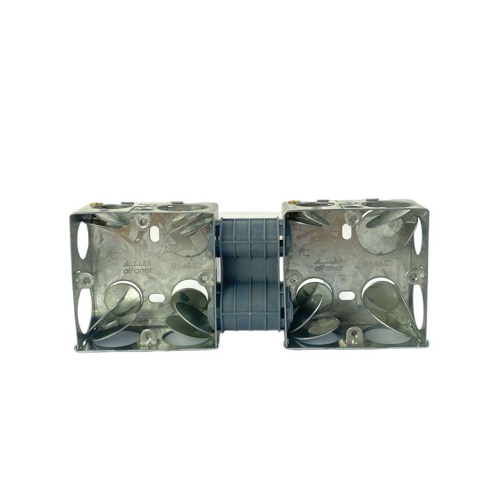 علبة حديد ثنائية أرضية مقاس 7×7 سم بعمق 3.5 مم، مصممة لتجميع وتثبيت الأسلاك والمفاتيح داخل الجدران بشكل آمن ومرتب.
