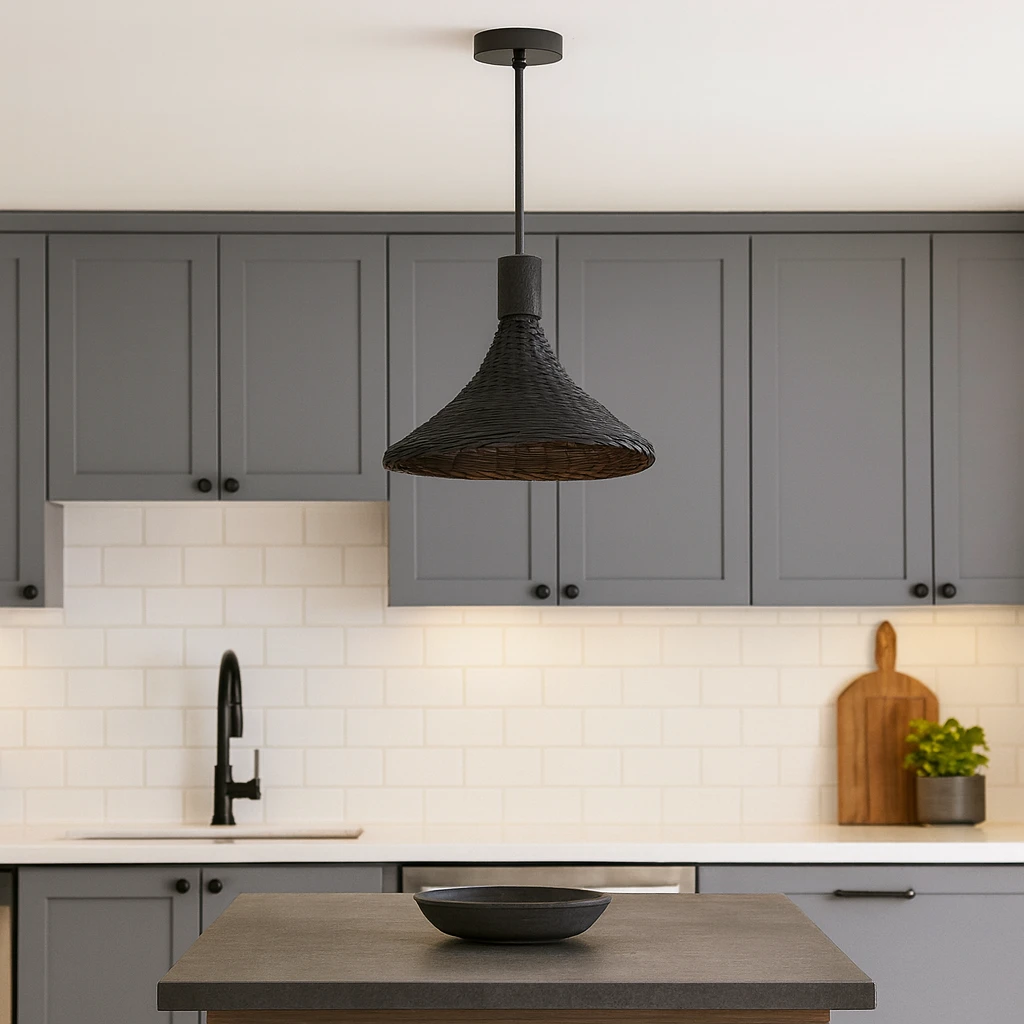 - تصميم معلّق مفرد بلمسة قش/حبل طبيعية.