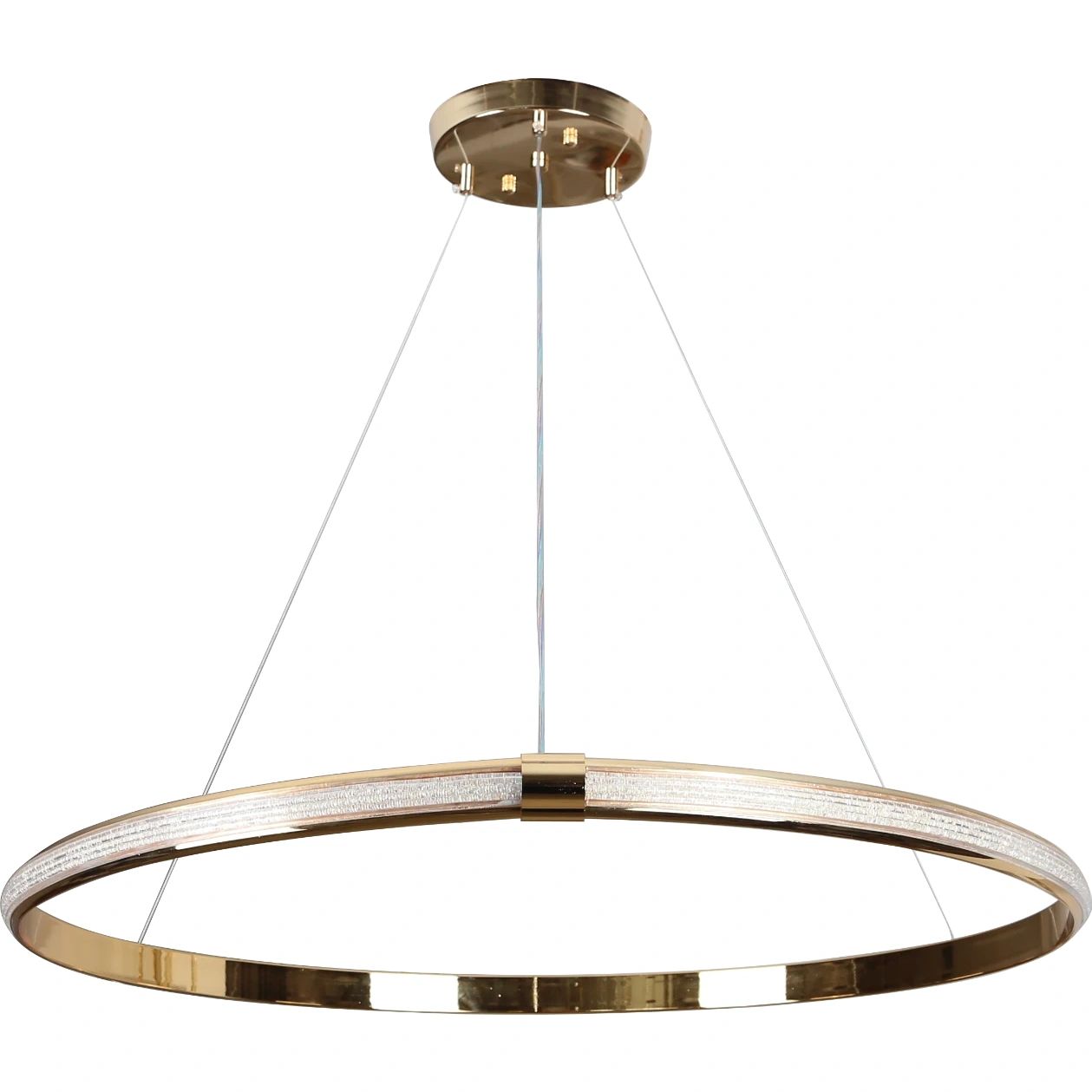 منتج إنارة معلق بتصميم مودرن أنيق بلمسة ذهبية لامعة، مثالي لإضافة طابع فاخر ومعاصر لبيتك أو مكتبك. شكل دائري وقياس 80 سم مع ثلاث مصادر إضاءة توفر توزيعاً متوازناً للضوء.